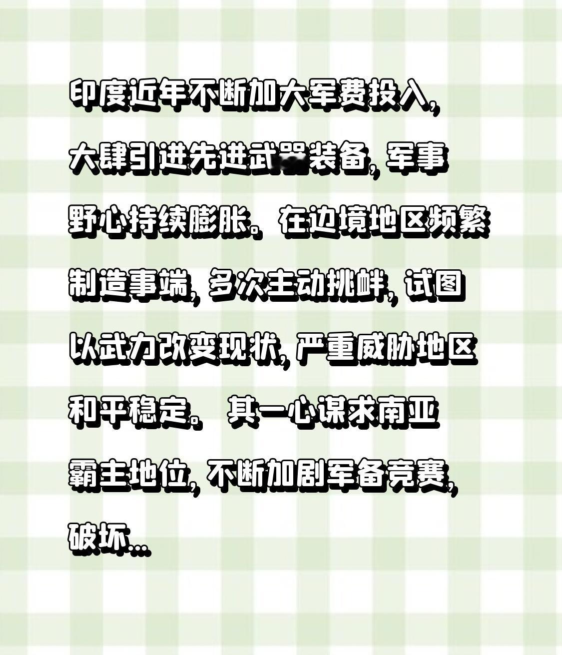 印度近年不断加大军费投入,大肆引进先进武器装备,军事野心持续膨胀。在边境地区频繁制造事端,多次主动挑衅,试图以武力改变现状,严重威胁地区和平稳定。 其一心谋求南亚霸主地位,不断加剧军备竞赛,破坏互信与对话氛围,给周边安全带来诸多不确定性。这种穷兵黩武、热衷对抗的做法,最终只会损害自身发展,更不利于区域长治久安。 军事热点 印度边境 南亚局势