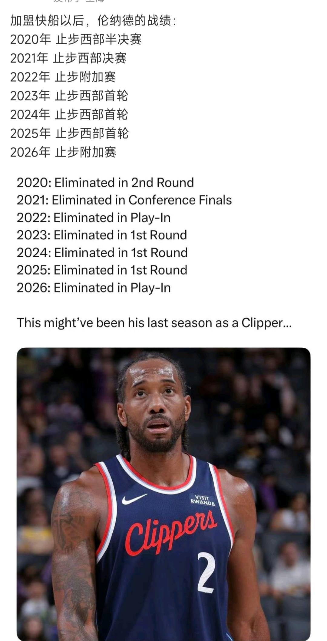 2019年之后伦纳德真不行,就是大水货。 在快船成绩很差,经常受伤。 今年似乎有点前途,季后赛都没进。 他年龄也不小了,属于他的2019年太远了。 或许快船该重建,换一个核心球员。[可怜]