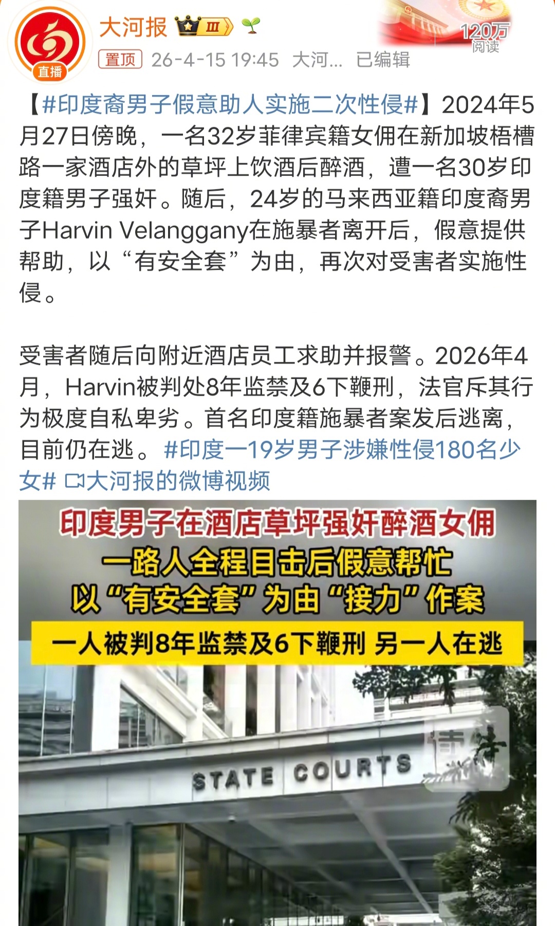 印度裔男子假意助人实施二次性侵2024年5月27日傍晚,一名32岁菲律宾籍女佣在新加坡梧槽路一家酒店外的草坪上饮酒后醉酒,遭一名30岁印度籍男子强奸。随后,24岁的马来西亚籍印度裔男子Harvin Velanggany在施暴者离开后,假意提供帮助,以“有安全套”为由,再次对受害者实施性侵。