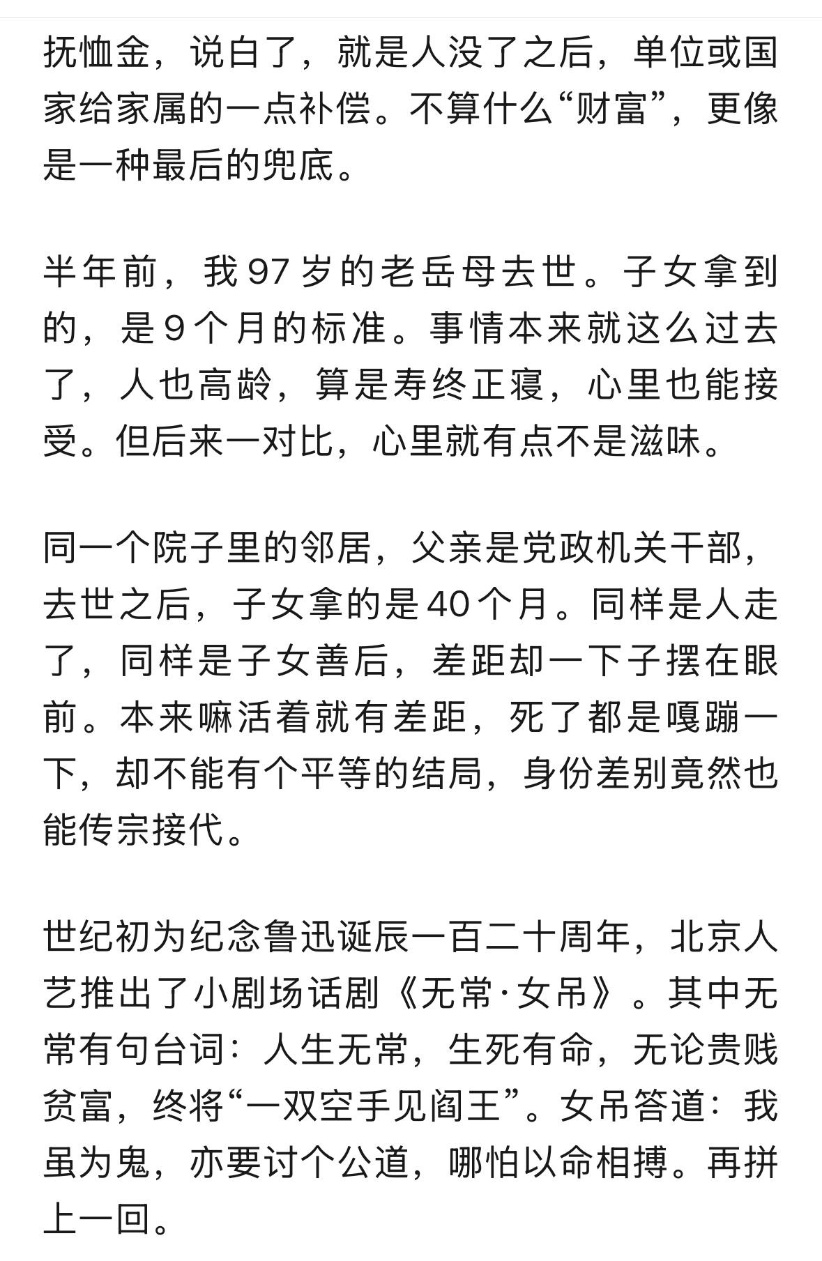 我理解的抚恤金应该是一个慰问金,不是财富赋予,除非是烈士,需要补贴亲属生活,一般人员去世以后,表示一下组织德关怀,是必要的。