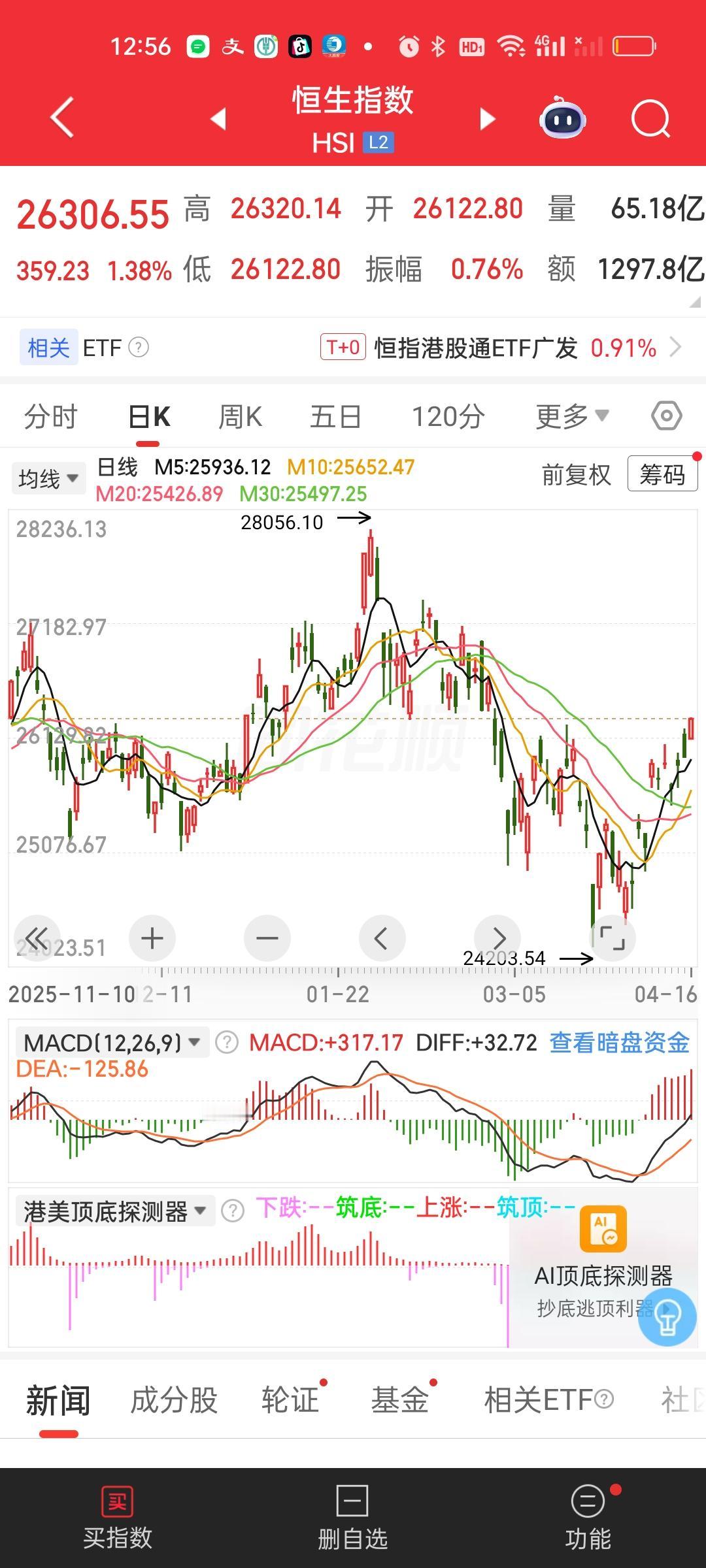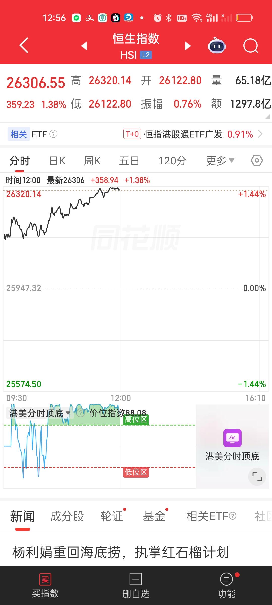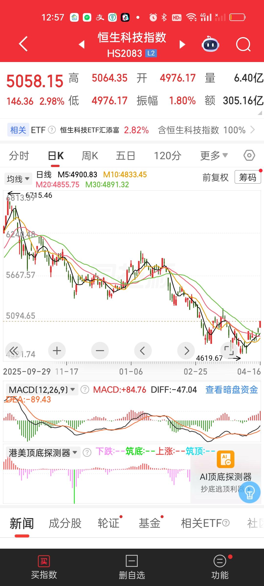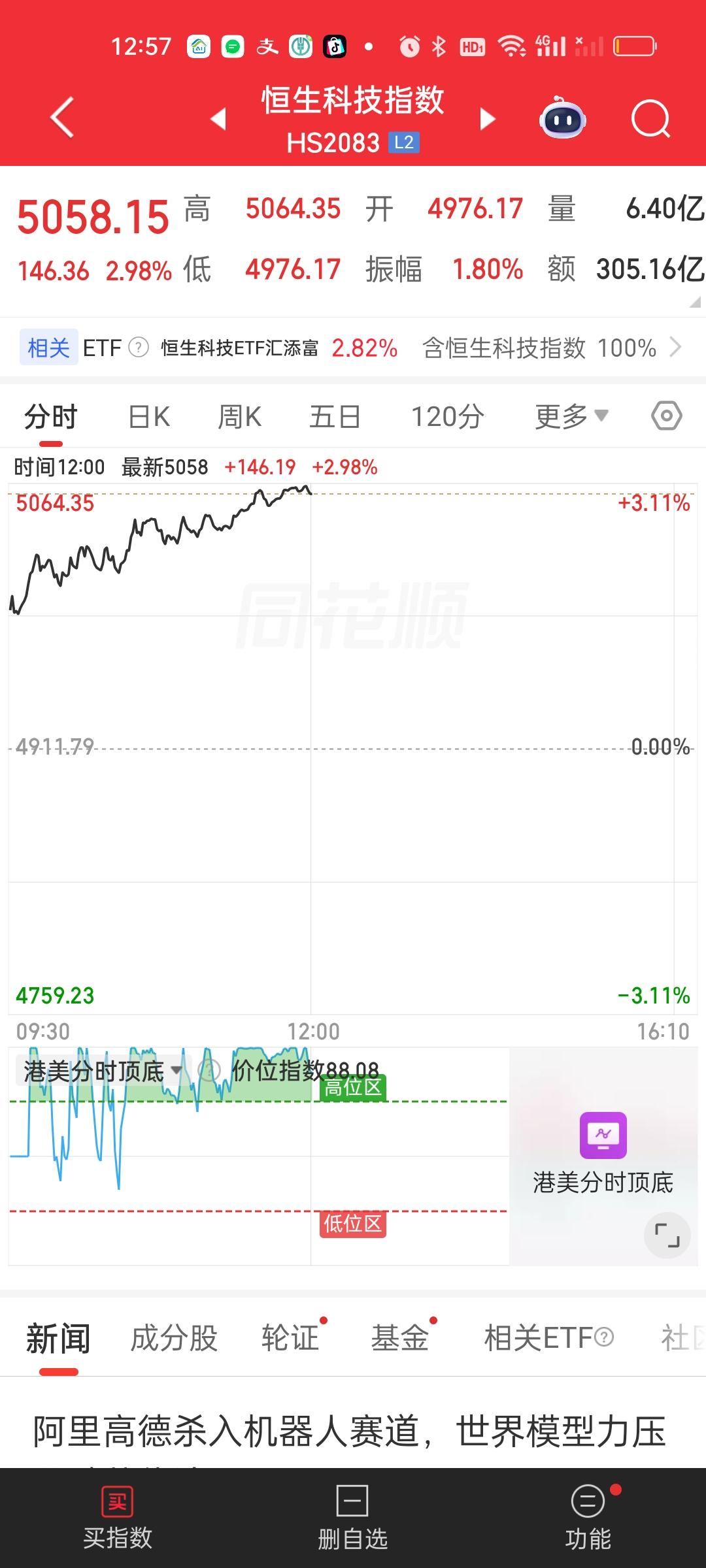 中午收盘,港股两大指数依旧稳稳站在所有均线上方。恒指还好,恒科今天有点疯狂,大涨3%。从低点4619.67起来到今天最高点5064.35,5064.35/4619.67=1.0963,已经上涨了9.63%,才几个交易日已经远超银行一年期定期存款收益。但这个地方依旧可以继续格局,反弹还没有结束!