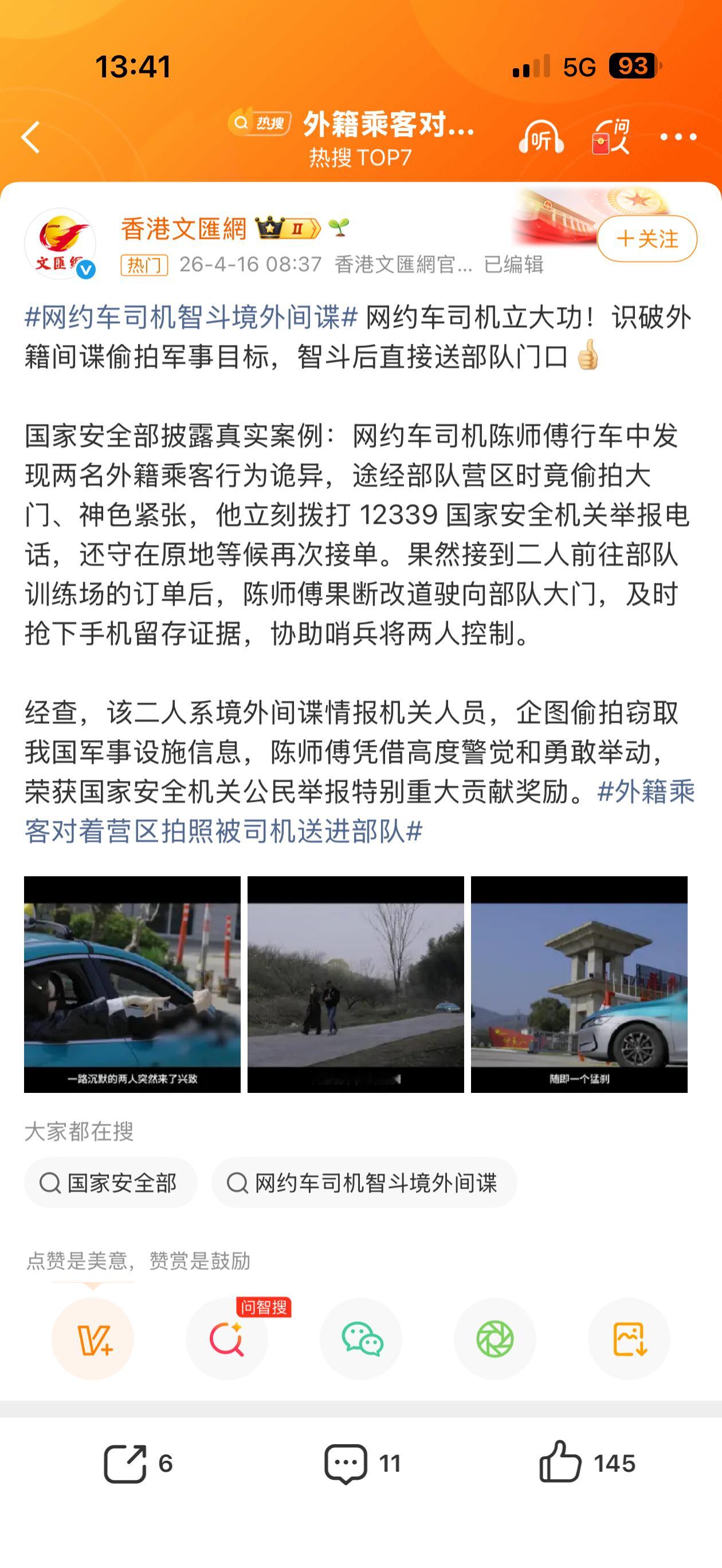 外籍乘客对着营区拍照被司机送进部队网约车师傅好样的!其实间谍真的很多我小时候去个