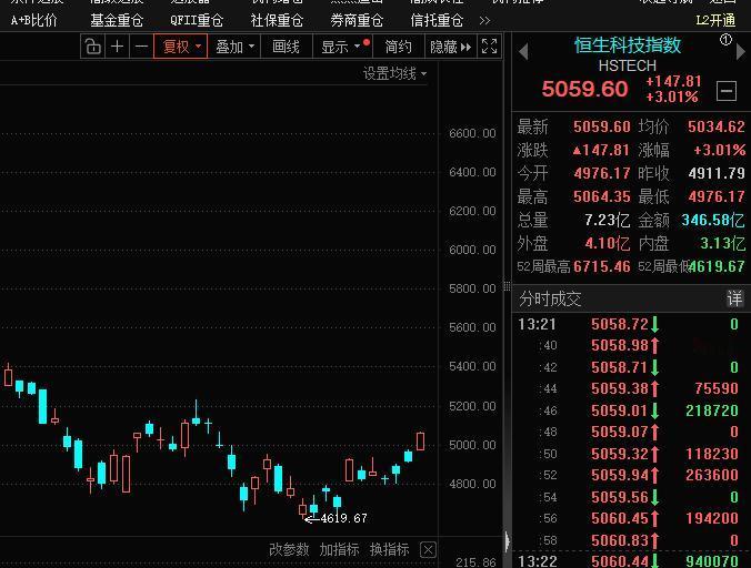 恒科挑战5%涨幅? 恒科重回3% 看能否站稳; 站稳后 今天尾盘会挑战5%涨幅。