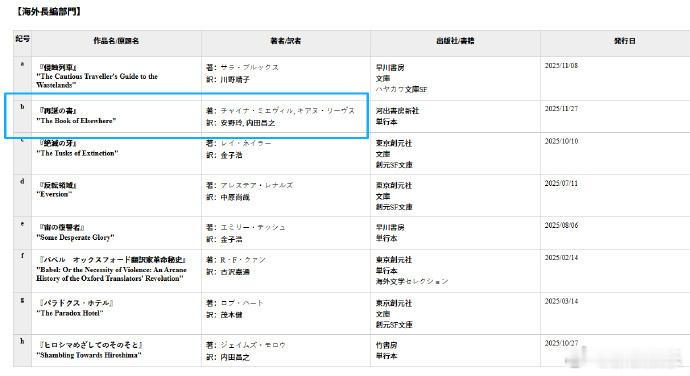 基努里维斯入围日本星云奖 据港媒,基努·里维斯与英国作家柴纳·米耶维合著的小说《The Book of Elsewhere》入围第57回日本星云奖海外长篇小说提名名单。据悉,日本星云奖是日本科幻界的重要奖项,刘慈欣《三体》、郝景芳《北京折叠》、安迪·威尔《挽救计划》等都曾获得过该奖海外部门奖项。