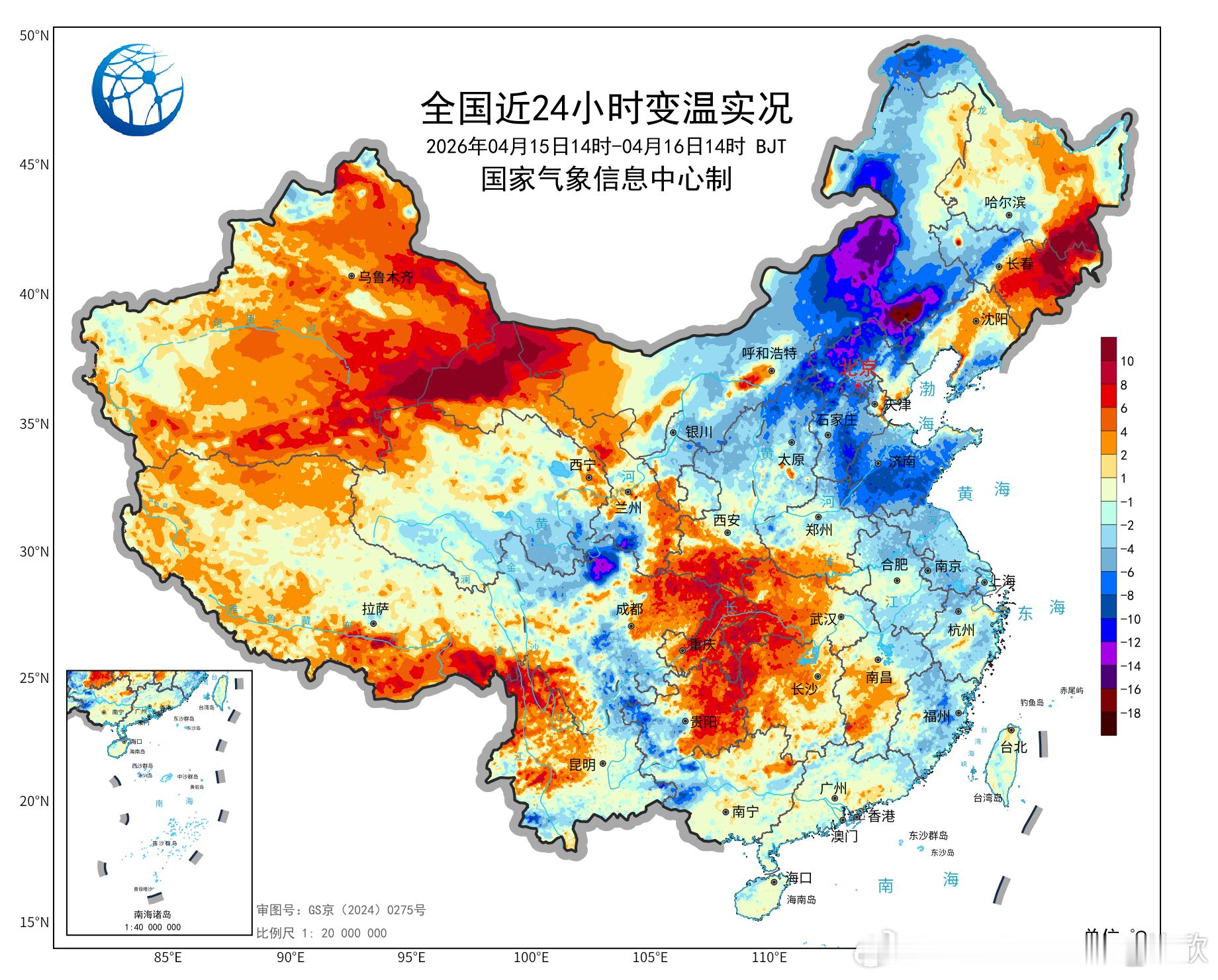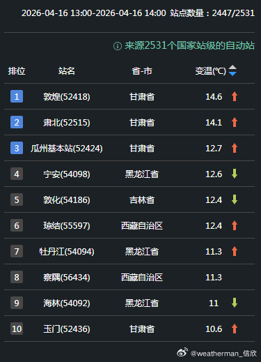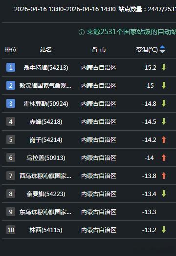 而昨天升温明显的内蒙古赤峰一带,今天因为冷空气+阴雨影响,又成了降温最强区域。昨天14时升温榜的第一、第二,今天14时又成了降温榜的第一、第二。昨天14时翁牛特旗升19.9℃、今天14时降15.2℃,敖汉旗昨天14时升19.7℃、今天14时降15℃。不出意外,明天这两个站点,还会重返升温榜,气温走势如同蹦极。