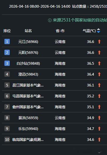 【海南高温减弱 内蒙古气温蹦极】今天海南高温继续减弱,截至14时最高,云南和海南只有7个站出现35℃以上高温。云南元江、元阳都是36.6℃,并列第一。海南白沙36.5℃、澄迈36.4℃紧随其后。从今天气温变化看,昨天降温明显的甘肃西部、西藏部分地区,升温明显,比如甘肃敦煌成为今天14时升温榜第一。