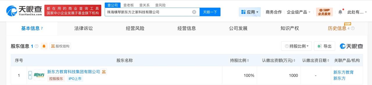 新东方在珠海横琴成立新科技公司 注册资本1000万 天眼查工商信息显示,近日,珠海横琴新东方之家科技有限公司成立,法定代表人为刘传文,注册资本1000万人民币,经营范围含网络技术服务、软件开发、信息技术咨询服务、食品销售、互联网信息服务、在线数据处理与交易处理业务、网络文化经营等。股东信息显示,该公司由新东方教育科技集团有限公司全资持股。 天眼查信息: