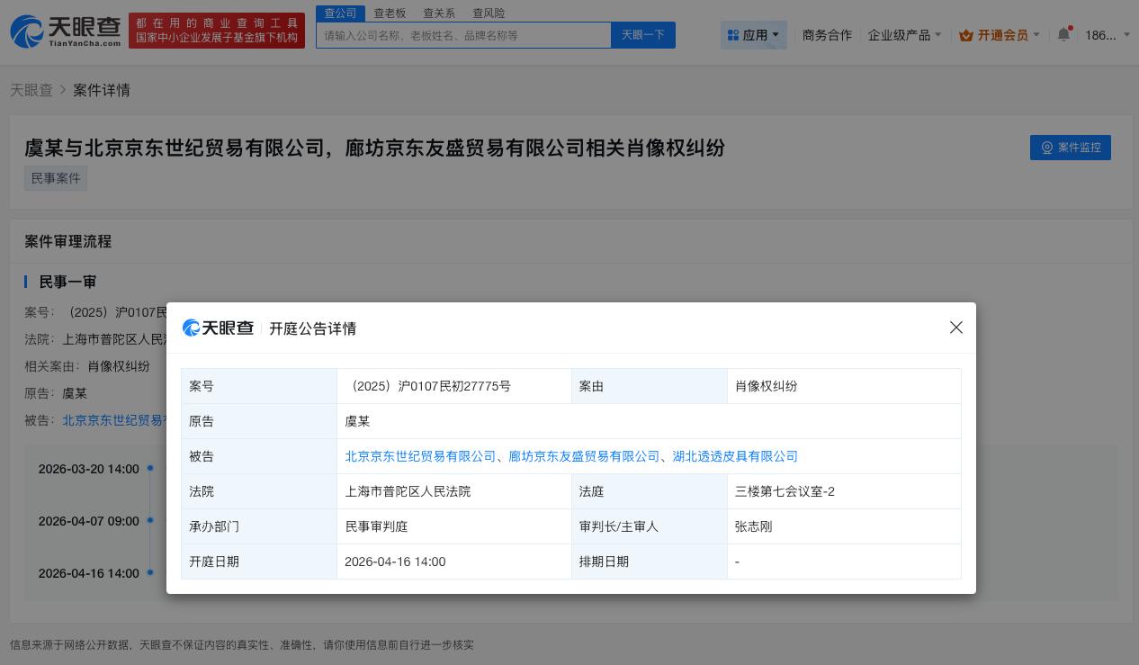 虞书欣起诉多方侵权即将开庭 虞书欣起诉多方侵权新增开庭公告 天眼查法律诉讼信息显示,虞书欣已多次发起名誉权纠纷、肖像权纠纷诉讼,被告涉及多个公司及自然人。其中,虞书欣起诉湖北透透皮具有限公司、北京京东世纪贸易有限公司、廊坊京东友盛贸易有限公司均于4月16日开庭。 天眼查信息:虞书欣
