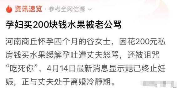 人间清醒!河南商丘,女子怀孕4个月,孕吐严重吃不下饭,就花200块买了点想吃的水果,谁料丈夫得知后大发雷霆,说女子一分钱不挣,就知道花钱,每月房贷车贷都是他还!女子也不服,说你每月烟酒钱也没少花,丈夫听后气急败坏,不仅动手推搡,还阴阳怪气说了句“吃 死你”,婆婆在一旁冷眼看着也不拦。女子心寒至极,做了一个让男子全家后悔不已的举动。 河南商丘,一场因200元水果引发的家庭闹剧,最后闹得人尽皆知。一名怀孕4个月的女子,仅凭一个果断举动,就让曾经辱骂推搡她的丈夫、冷眼旁观的婆婆,彻底陷入悔恨之中,没人能想到,这场看似不起眼的争执,会成为这个家彻底散场的导火索。 男子全家的后悔,全是自己亲手造成的。他们无论如何也想不到,那个被他们肆意指责、冷漠对待的孕妇,会如此决绝,不给他们留一丝挽回的余地。而这一切的起因,不过是女子花200元,买了些能缓解孕吐的水果。 事情要从女子怀孕4个月说起,孕期的她被严重的孕吐困扰,吃什么吐什么,哪怕是清淡的白粥,也咽不下去几口,日渐消瘦,连浑身都没力气,只能在家静养,没法再上班挣钱,所有精力都放在调理身体、保住孩子上。 孕吐的煎熬让她苦不堪言,偶然间看到科普说,柠檬、苹果这类水果能缓解孕吐,还能补充孕期所需的维生素,她便动了买水果的心思。纠结了很久,想着能少遭点罪,也给孩子补点营养,她才咬牙花200元,买了些新鲜时令水果。 水果刚送到家,丈夫就下班回来了。看到门口的水果包裹,他随口问了价格,得知花了200元后,瞬间炸了锅,当场就翻了脸,对着女子破口大骂,语气里满是鄙夷和不耐烦,丝毫没顾及她是个怀孕的孕妇。 他指着女子的鼻子,不停指责她好吃懒做,说她自从怀孕就辞职在家,一分钱不挣,却学会了乱花钱,200元买一堆水果纯属浪费。他还不停抱怨自己的辛苦,说家里每月的房贷、车贷,全靠他一个人扛,压力大到喘不过气。 女子看着丈夫歇斯底里的模样,积压多日的委屈一下子涌了上来。她看着丈夫,想起他每月花在烟酒上的钱,比这200元多得多,却从不说浪费,自己只是买些缓解孕吐的水果,就被如此苛责,心里满是不甘。 被女子戳中痛点,丈夫瞬间恼羞成怒,再也控制不住脾气,上前就对女子动手推搡。女子本就因怀孕身体虚弱,被他一推,踉跄着后退了好几步,差点撞到墙上。他还不解气,站在原地阴阳怪气地辱骂,说出“吃死你”的狠话。 当时,婆婆就坐在客厅的沙发上,全程看着这一幕,没有说一句话,没有拦一句。她面无表情,眼神冷漠,仿佛眼前被推搡、被辱骂的,不是自己的儿媳,不是一个怀着自家骨肉的孕妇,只是一个无关紧要的陌生人。 那一刻,女子彻底心死了。她没有再和丈夫争吵,也没有流泪,只是静静地看着眼前这两个最亲近的人,心里一片冰凉。她忽然明白,在这个家里,她的委屈、她的煎熬、她的身体,从来都没人真正在乎,她不过是个多余的累赘。 她缓缓站起身,没有看丈夫和婆婆一眼,默默收拾好自己的随身物品和产检资料,转身就走出了这个冰冷的家。她没有回娘家,也没有向朋友哭诉,而是直接去了医院,做了一个深思熟虑后的决定,每一步都走得格外坚定。 丈夫和婆婆看着她决绝的背影,一开始还满不在乎,觉得她只是闹脾气,用不了一天就会自己回来认错。可直到天黑,女子依旧没有回来,也没有任何消息,他们才开始慌了神,四处打电话、找朋友,却始终联系不上她。 他们四处打听,辗转多日,才终于得知女子的决定——她已经决定终止妊娠,并且提出分开,彻底脱离这个没有温度的家。得知真相的那一刻,丈夫和婆婆彻底懵了,满心都是悔恨,可无论他们怎么道歉、怎么挽回,都无济于事。 女子后来暂住到了朋友家,慢慢调理身体,重新找了一份轻松的工作,开始了新的生活。她不再被家庭的冷漠消耗,不再为不值得的人委屈自己,活得清醒又自在。而男子和婆婆,只能守着空荡荡的房子,独自承受自己种下的苦果。 女子的选择,从来都不是一时冲动,而是日积月累的失望和心寒。200元的水果,从来都不是争执的根源,而是压垮骆驼的最后一根稻草。 对此,你们有什么看法,欢迎评论留言~
