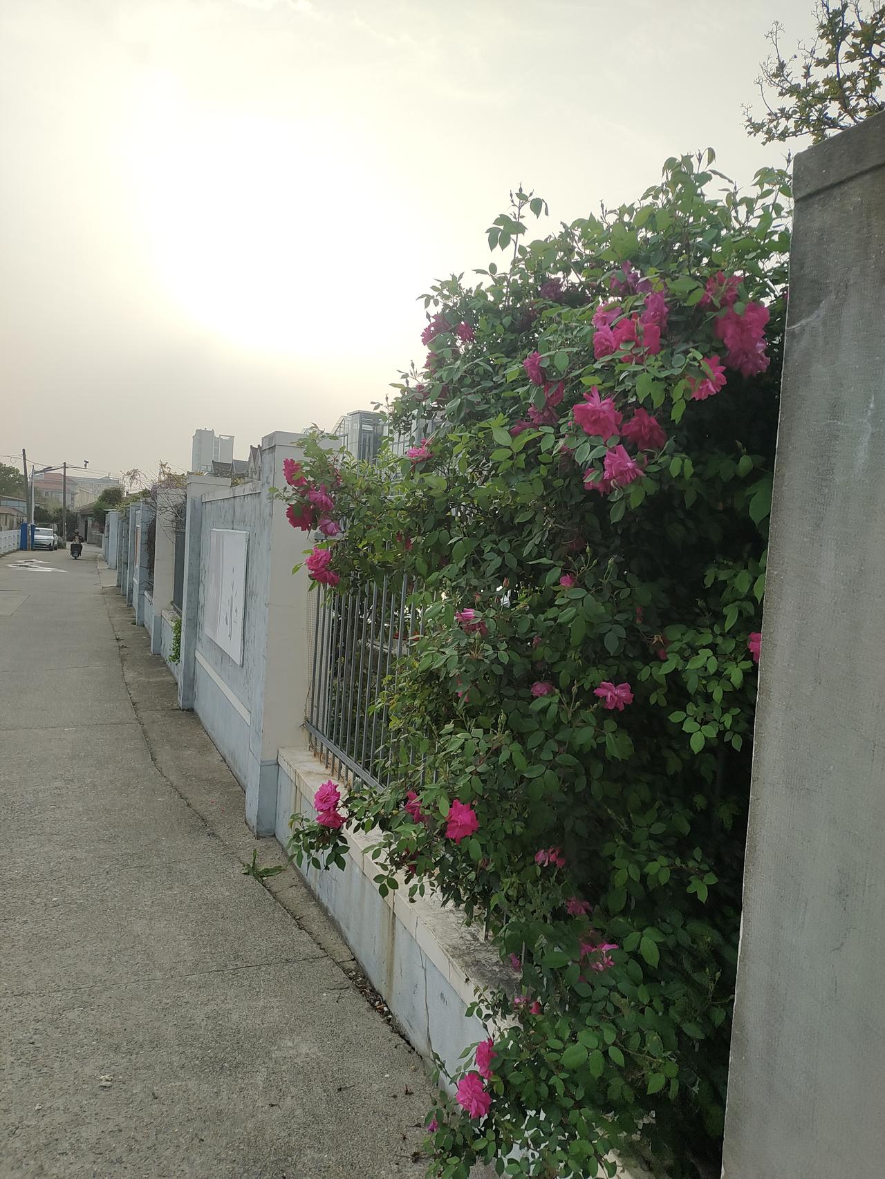花开正浓 正是月季盛开的季节,各种花色伴随着清香淡淡袭来,婉如身着纱裙的少女,偷偷的爬上墙头,看看外面的世界。 这是小区门口的场景,美不?