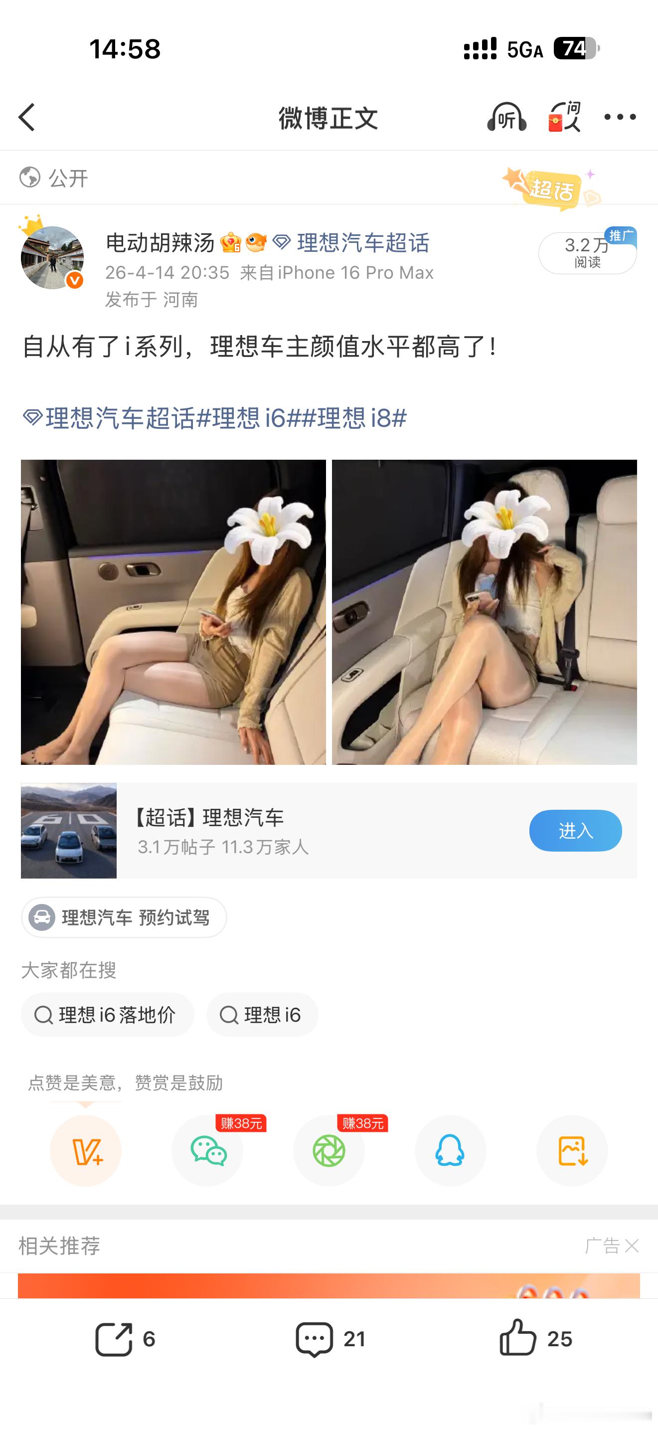 本来是一条美女车主晒理想i6 车的博文,评论区却会出现这样的评论,不太明白这种人内心怎么会这么低俗…