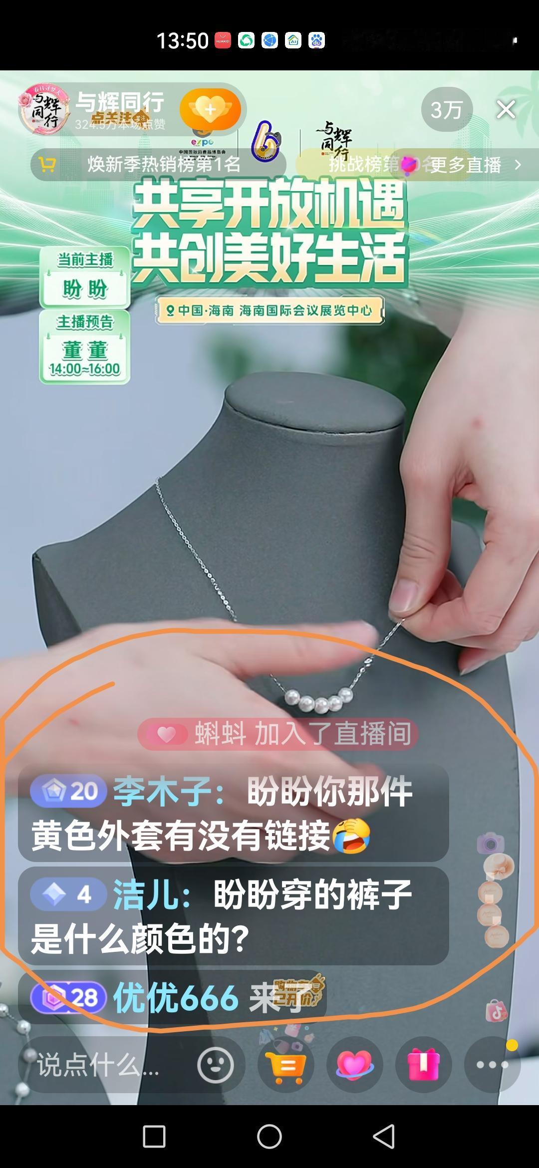 正看盼盼讲项链,又被评论区里的几条评论给吸引了。[比心] 直播间里的粉丝朋友们,这个时候没有关注盼盼讲的珍珠,而是一个劲儿的问:“盼盼身上的裤子啥颜色”、“盼盼你那件黄色外套有没有链接”(应该是图三) 盼盼不仅是与辉同行直播间的主播,还兼职模特儿,只有她上播,身上的衣服、裙子👗、裤子都是抢手货,哈哈,211的同学们太给力了。 美盼,美的不像话,大家都喜欢看她直播。[呲牙][鼓掌][鼓掌]带定位晒今日生活 我的今日状态:😁轻松愉快 我这里的天气:☀️晴天