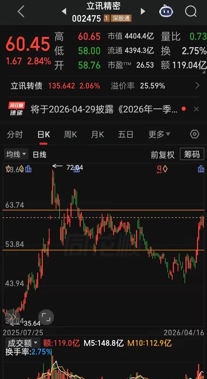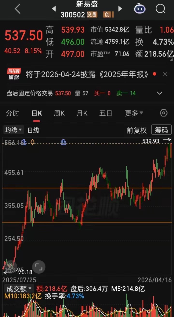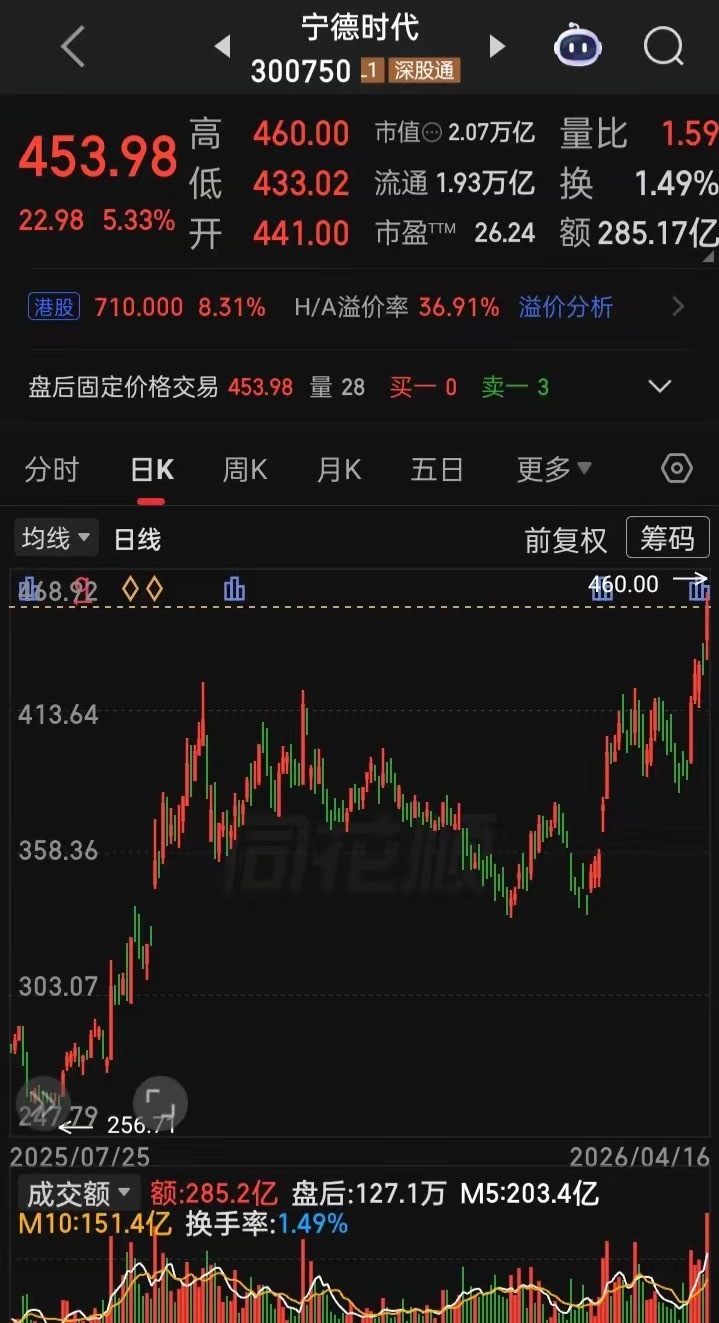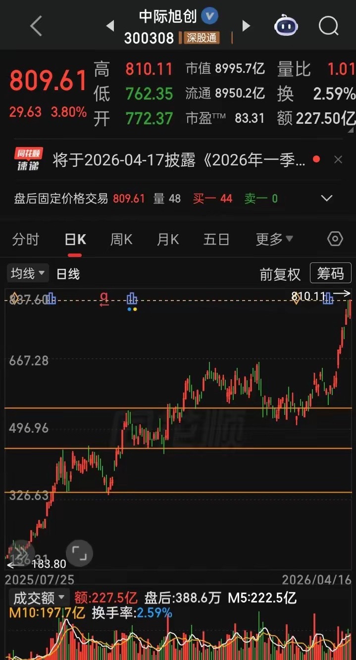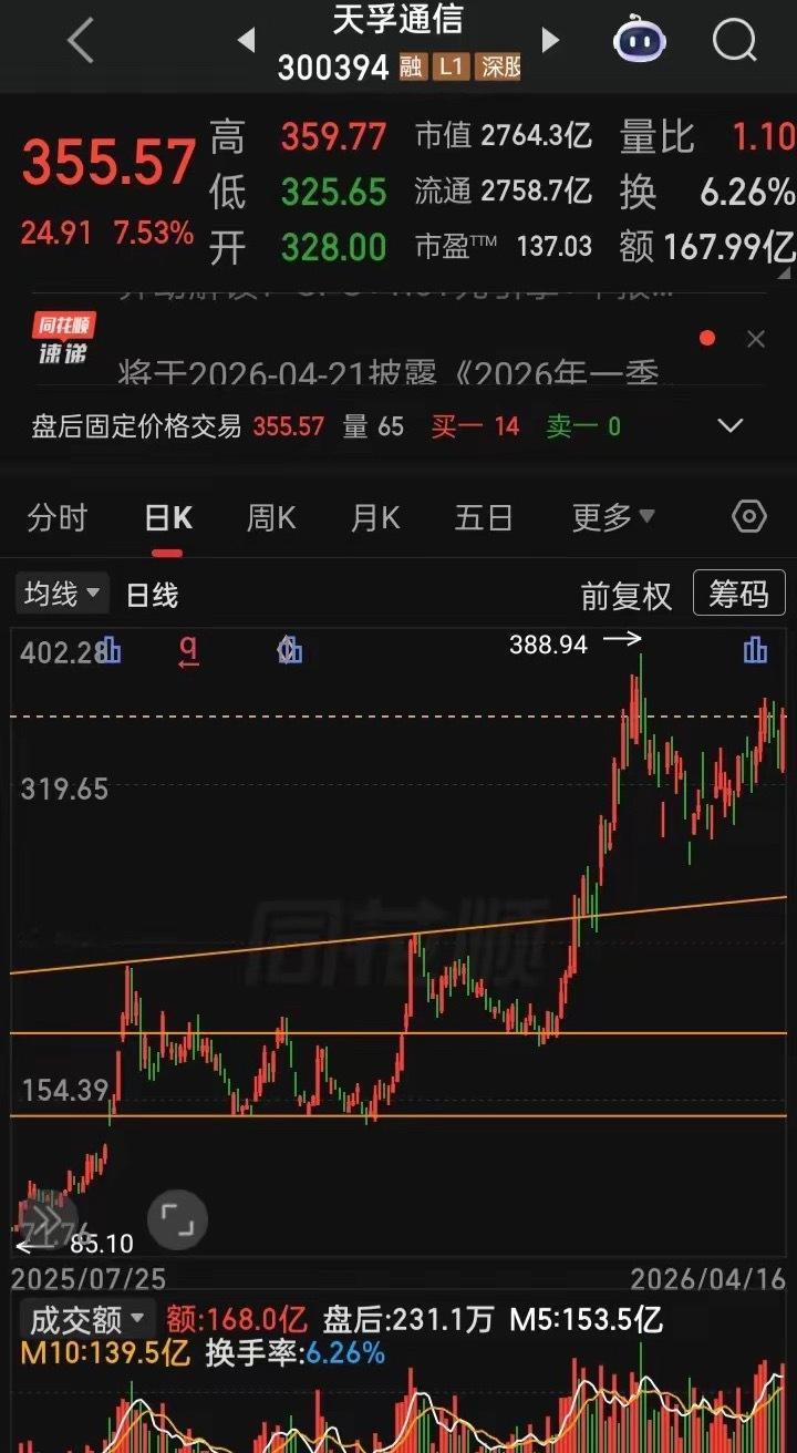 【每日观察2026.04.16】a三大指缩量上涨,在总成交额23550亿比上个交易日缩量745亿、上涨4293家下跌1072家、涨停88家跌停9家的情况下,谁在成交额前十宁德时代285.17亿,涨5.33%(再创新高,收盘首次总市值站上2万亿)中际旭创227.50亿,涨3.80%(再创新高)新易盛 218.56亿,涨8.18%(再创新高)天孚通信167.99亿,涨7.53%佰维存储125.94亿,涨0.49%胜宏科技120.46亿,涨2.73%立讯精密119.04亿,涨2.84%东山精密118.43亿,涨2.57%兆易创新114.32亿,涨4.65%芯原股份111.79亿,跌3.75%