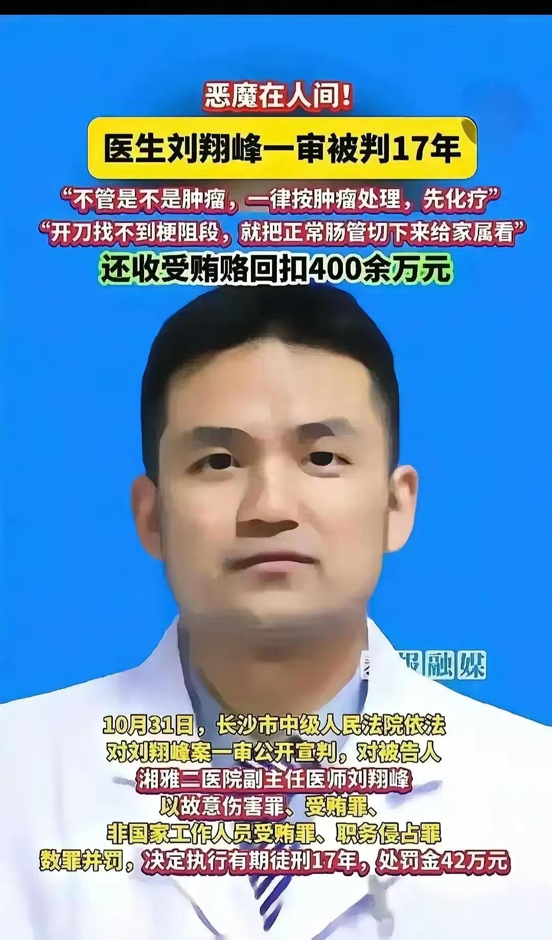 普通患者按照癌症患者处置,湘雅医生刘翔峰一审获刑17年!白大褂下的恶魔,这是以治病之名,行杀人之实啊,17年太便宜它了。 当“医生”这个职业,被用来当成谋财害命的工具,当“救死扶伤”的誓言,被踩在脚下当成废纸,湘雅二医院原副主任医师刘翔峰,因故意伤害罪、受贿罪、非国家工作人员受贿罪、职务侵占罪数罪并罚,判处有期徒刑17年,罚金42万元。这个在白大褂包裹下的恶魔,终于为自己的滔天罪行,付出了法律的代价。 为了牟取手术费,他给6名完全不具备手术指征的患者实施手术,造成5人重伤九级伤残、1人轻伤;为了骗家属,他找不到肠梗阻的梗阻段,就切下患者一段完全健康的肠管,拿着正常组织谎称是病灶;为了赚黑心钱,他不管患者是不是肿瘤,一律按肿瘤处理,先上化疗,把健康人硬生生治成病人;更令人发指的是,他利用职务便利,收受医药回扣358万余元,收受贿赂66万余元,还非法侵占193万余元的手术耗材,把医院当成了自己的提款机,把患者当成了待宰的羔羊。 这哪里是医生?这是披着白大褂的恶魔,是潜伏在医院里的刽子手。 17年的刑期,是法律对刘翔峰最严厉的惩罚,却永远无法弥补受害者们一生的伤痛。我们更要警惕,不能让“刘翔峰们”,仅仅是一个名字,一个被遗忘的案件。医疗反腐,从来都不是一句口号,它关系到每一个普通人的生命安全,关系到整个社会的信任底线。 刘翔峰一审获刑17年 湘雅二医院 医疗反腐 医德败坏