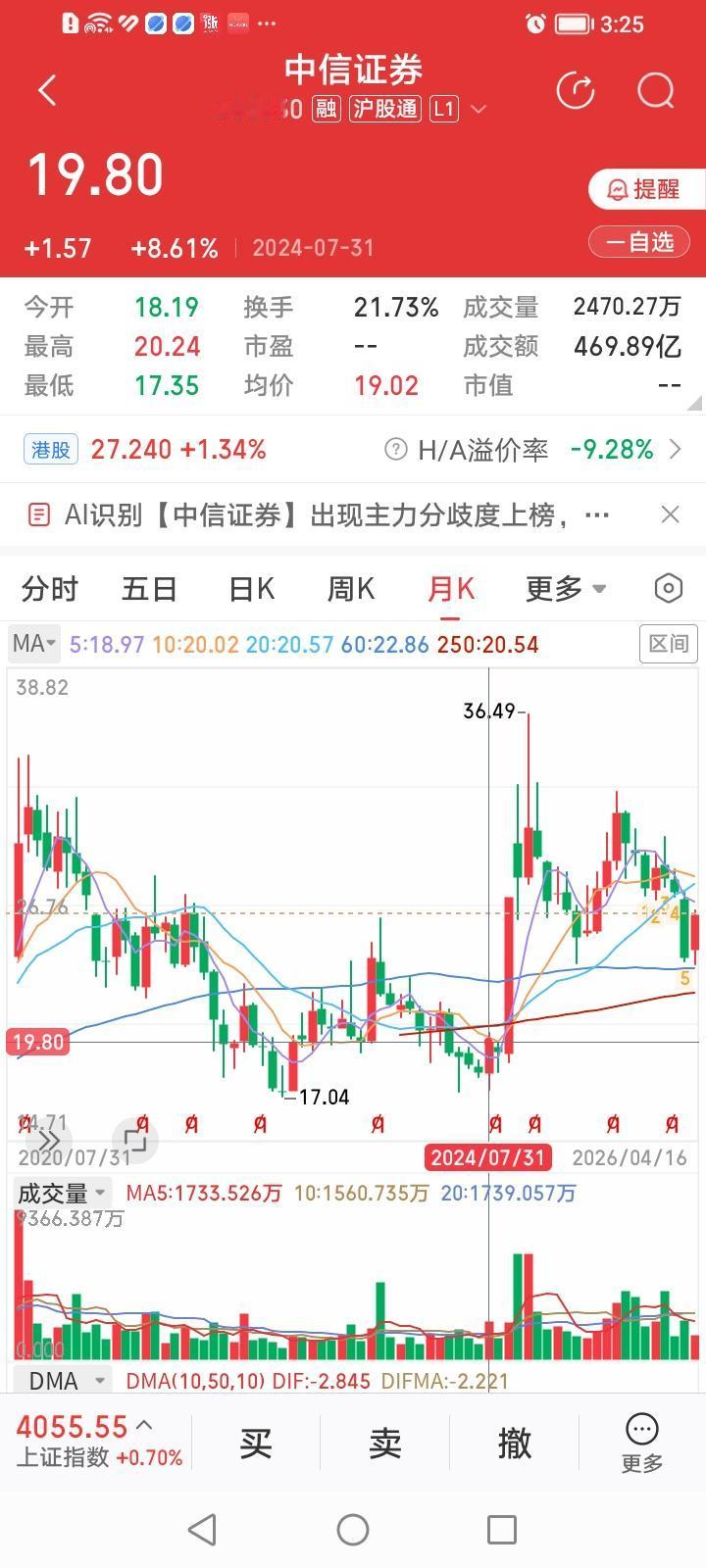 中信证券,牛角初露声声慢!中信证券今天收盘小幅上涨1.15%,涨幅居券商股涨幅排行榜第五名。 中信证券在4月10号因一季报业绩大增刺激大涨7.25%后,连续五个交易日在26元左右做平台整理,为攻击60日均线蓄势。 自从2024年9.24行情启动一波幅度高达110%的大涨行情后,中信证券2025年录得年度涨幅为负。 通过近两年的股价充分蓄势整理,加之中信证券今年业绩增长势头不错,正所谓“三年不开张,开张吃三年”,中信证券会否成为今年的牛市黑马?重现券商股龙头风采?