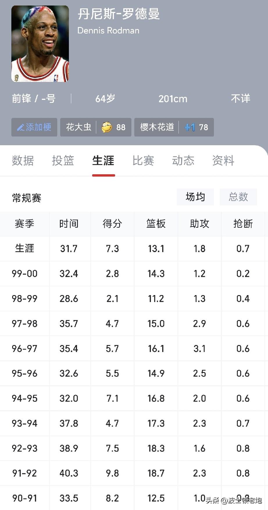 我不明白为何有人为了贬低乔丹,竟然将罗德曼吹捧为“巨头”,太不实事求是了。 罗德曼篮板球能力自是没话说,2米出头的身高,竟然拿了7次篮板王,更何况还是在传统中锋称霸的年代,但你要说他是巨头我第一个不同意。 生涯场均得分不到10分,就是他成为巨头的最大障碍,而且他在加盟公牛之前市场行情跌到了谷底,联盟中大多数球队都不敢要他,他即是最强的盾,也是最烈的毒。 要知道芝加哥公牛只用了一个替补中锋威尔·珀杜就单换了罗德曼,你见过这么便宜的巨头吗?
