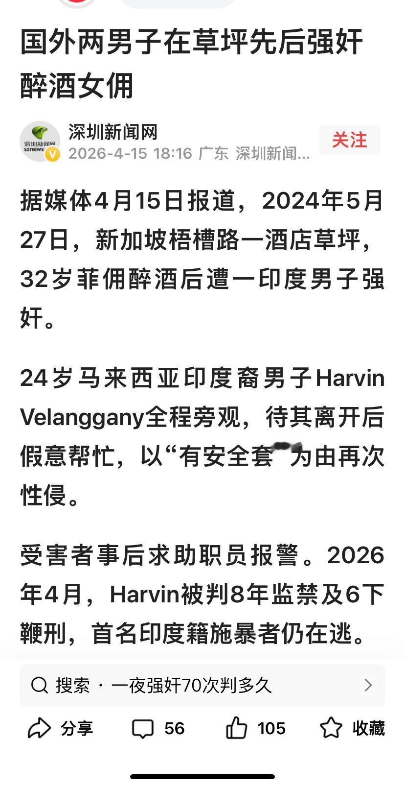 简直大跌眼镜! 新加坡酒店草坪上绝望的连锁伤害!32岁菲律宾女佣好不容易休假了,她想趁休假时光好好休息一下,她买了些啤酒,躺卧在酒店草坪上晒着太阳,喝着啤酒🍻,非常惬意。 她万万没想到一个印度籍男子路过草坪看到她后竟然心生歹念,他在光天化日之下强暴了她。更让她没想到的是一个来自马来西亚男子哈尔文在旁边不但没有制止印度男子施暴,反而全程围观,等印度男子走后,哈尔文居然掏出安全套性侵了她。该女佣本来惬意休假时光受到了两次身心伤害,实在在是太可怜了。 哈尔文因强奸罪被判处8年监禁及6下鞭刑。那名印度籍施暴者作案后迅速逃离新加坡,至今仍逍遥法外。 从小听说新加坡是法治国家,纪律严明,最出名的莫过于吐口香糖也要判鞭刑。 不知道逍遥法外的印度人何时归案,如果被抓,要判处他几年刑期?几下鞭刑? 新加坡悲剧 法国职场性侵 新加坡旅游酒店 新加坡女佣聚会 新加坡事故 酒店里的悲剧 新加坡轻生事故