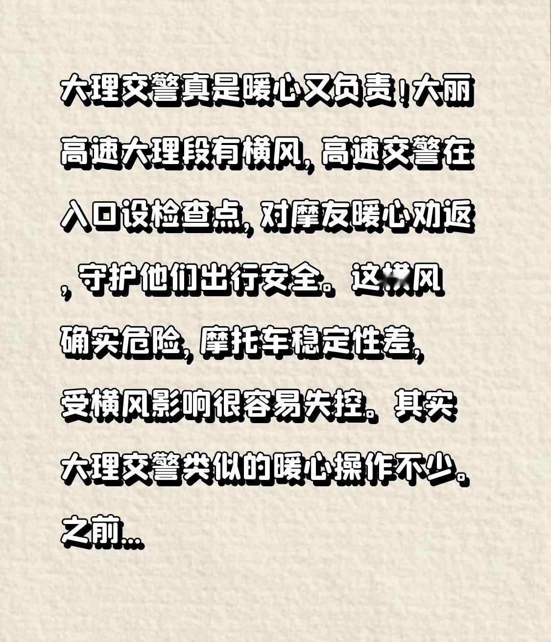 大理交警真是暖心又负责![心][心][心] 大丽高速大理段有横风,高速交警在入口设检查点,对摩友暖心劝返,守护他们出行安全。这横风确实危险,摩托车稳定性差,受横风影响很容易失控。 其实大理交警类似的暖心操作不少。之前还有民警处置行人误入高速的警情,把疑似精神疾病的行人送回家。另外,大临高速部分段禁摩也是为安全考虑,这条高速隧道多,开通至今已发生4起摩托亡人事故。不得不说,大理交警在保障道路安全上真是下足了功夫。