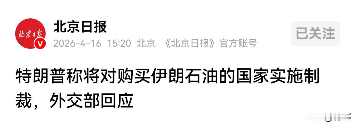 特朗普:中国不会停止买伊朗石油,美国将对买油国实施制裁 在4月16号我国外交单位发布的记者会上有路透社的记者提出了一个问题,说美国当地时间15号的时候,总统特朗普表示相信中国将不会停止购买伊朗的石油。美国将对购买伊朗石油的国家实施制裁。请问中国对此有何评论? 对此我们的发言人的回应是: 中方一贯反对没有国际法依据、未经联合国安理会授权的非法单边制裁。 特朗普无论是封锁霍尔木兹海峡,还是威胁其他国家,不要购买伊朗的石油,包括直接指名道姓地提到我国购买伊朗石油的可能性这些做法,全部都是建立在这个超级大国霸权主义的单边操作上。这些做法也许对一些地区性的国家可以产生一定的效果,但是对于同样作为世界大国的中国来说,不存在任何的威慑和约束力。中国也绝对不会按照美国人的意图决定是否购买伊朗的石油。 特朗普不仅指名道姓的提到我国购买伊朗石油的可能性,还直接声称,自己已经致信我国的高层,要求中国不要向伊朗提供武器,中国在回信中表示不会这么做。 这位美国总统的一些言论,现在早就已经没有什么可信度了。在这种情况下,特朗普的访华计划,大概率会被一再搁置,因为这个时候实在没有啥必要见面。