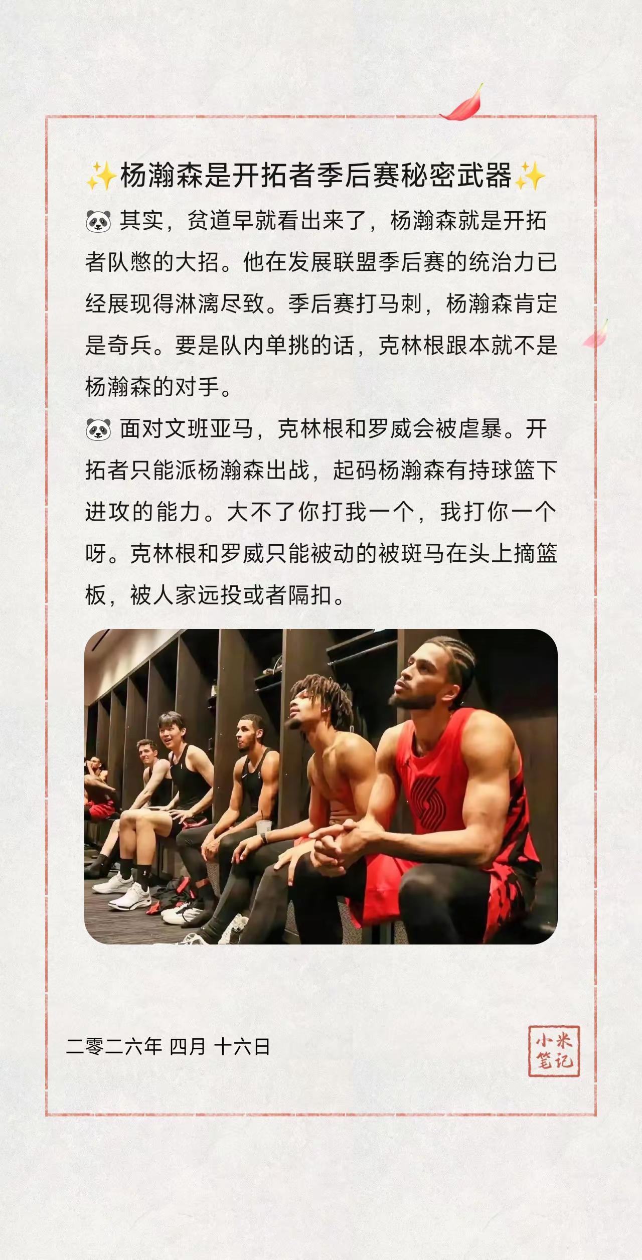 ✨杨瀚森是开拓者季后赛秘密武器✨。🐼 其实,贫道早就看出来了,杨瀚森就是开拓者队憋的大招。他在发展联盟季后赛的统治力已经展现得淋漓尽致。季后赛打马刺,杨瀚森肯定是奇兵。要是队内单挑的话,克林根跟本就不是杨瀚森的对手。🐼 面对文班亚马,克林根和罗威会被虐暴。开拓者只能派杨瀚森出战,起码杨瀚森有持球篮下进攻的能力。打不了你打我一个,我打你一个呀。克林根和罗威只能被动的被斑马在头上摘篮板,被人家远投或者隔扣。 —— 看吧!杨瀚森就是用来应对文班亚马的,还记得杨瀚森打扎克艾迪吗?杨瀚森打文班亚马比打扎克艾迪轻松。杨瀚森的篮下技术和力量打斑马一点问题都没有。当大家看到杨瀚森连续打了斑马几个,就会想起当年姚鲨对决,媒体立刻就疯狂了!小杨打的就是对方的精锐,一战成名。作者:龙须面🧐