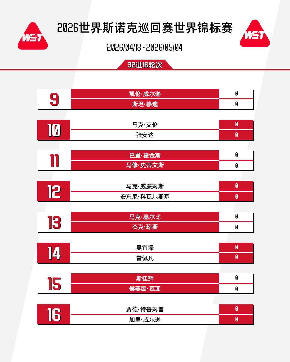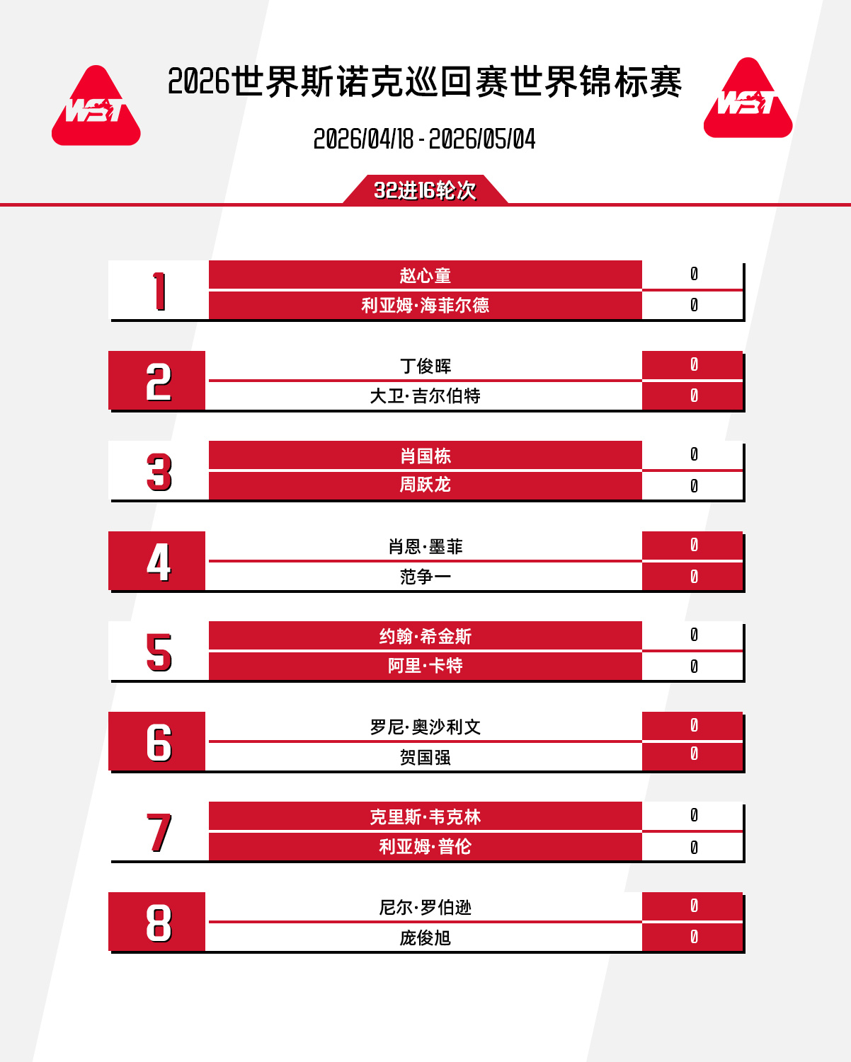 赵心童 vs 利亚姆·海菲尔德丁俊晖 vs 大卫·吉尔伯特;肖国栋 vs 周跃龙; 肖恩·墨菲 vs 范争一 ;