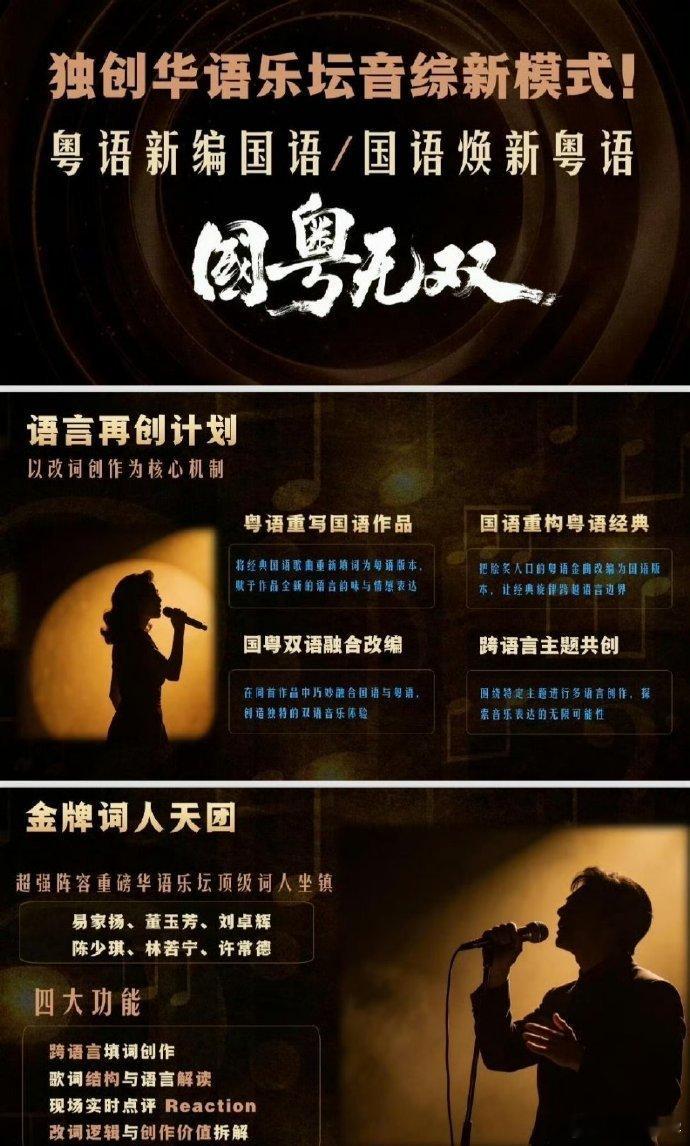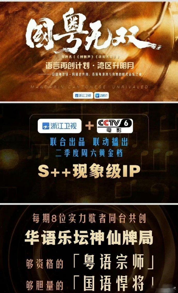 今年歌手都来浙江卫视了今年歌手都奔赴浙江卫视赴音乐之约,《国粤无双》以国粤互译为创意,邀请传奇唱将与实力新人同台,每一组搭档都能擦出不一样的音乐火花,二季度周六档准时蹲守开播。