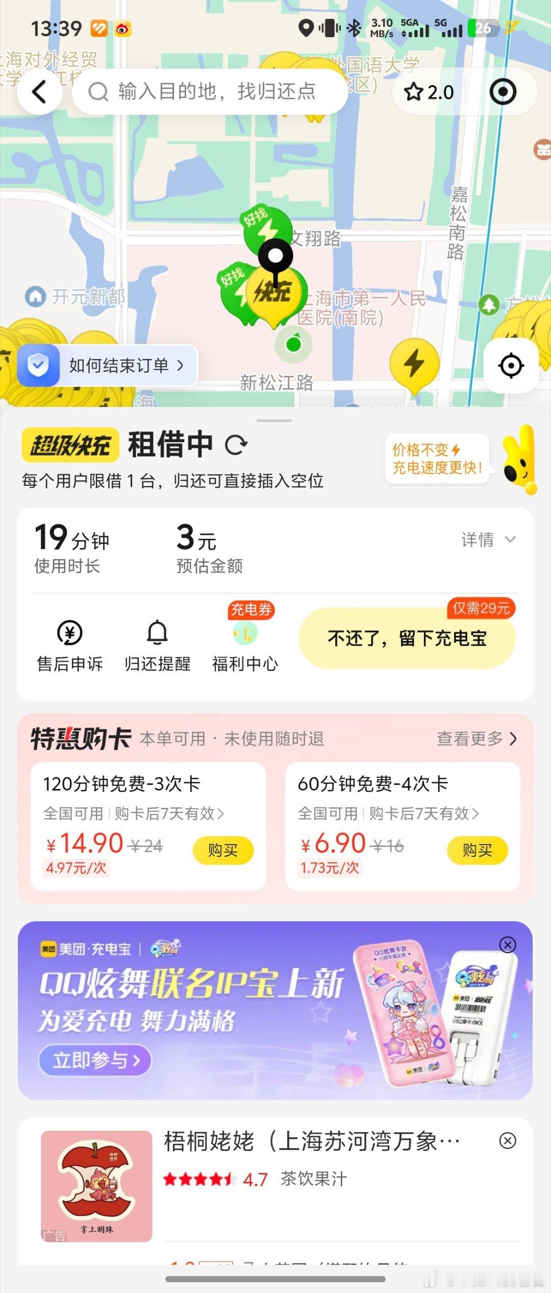 美团在医院设置的充电宝是3元/30分钟。我自己是觉得还挺贵的然后系统还假意提醒了下这个费用比较高,建议我去其他区域。问题是医院里面不都是这个价格?属实是资本家的伪善了。1个充电宝出借13小时回本 上海·上海市第一人民医院(南院)
