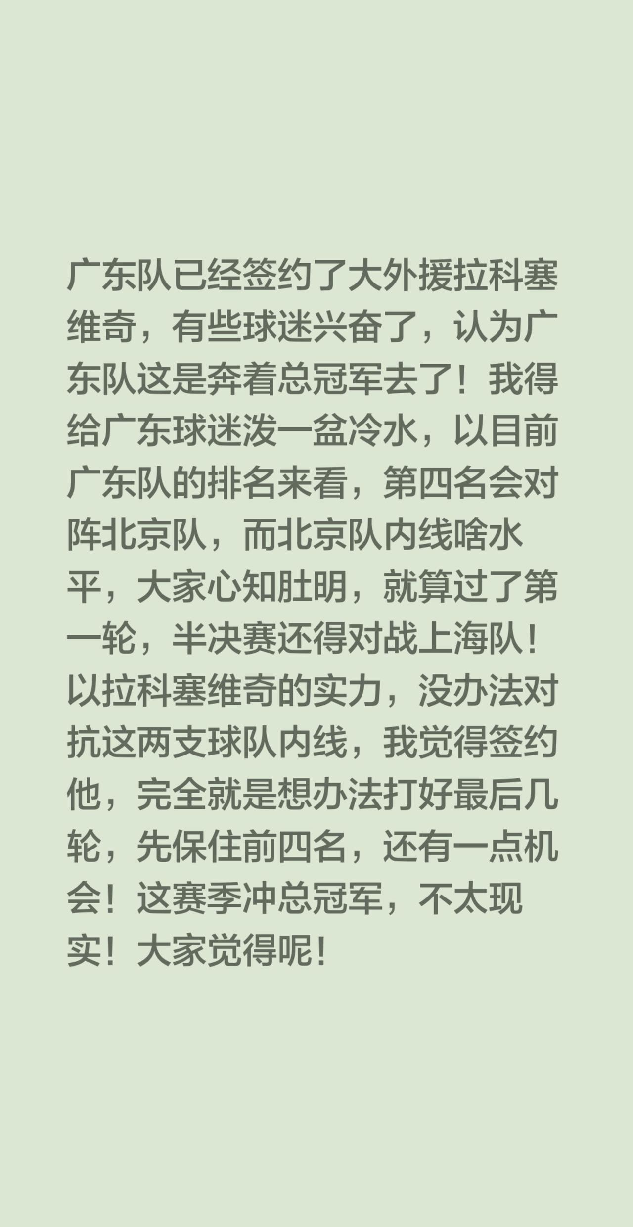 拉科塞维奇真的不是救世主!广东队已经签约了大外援拉科塞维奇,有些球迷兴奋了,认为广东队这是奔着总冠军去了!我得给广东球迷泼一盆冷水,以目前广东队的排名来看,第四名会对阵北京队,而北京队内线啥水平,大家心知肚明,就算过了第一轮,半决赛还得对战上海队!以拉科塞维奇的实力,没办法对抗这两支球队内线,我觉得签约他,完全就是想办法打好最后几轮,先保住前四名,还有一点机会!这赛季冲总冠军,不太现实!大家觉得呢!上热门 广东男篮最新消息 cba总冠军 上海男篮vs广东男篮