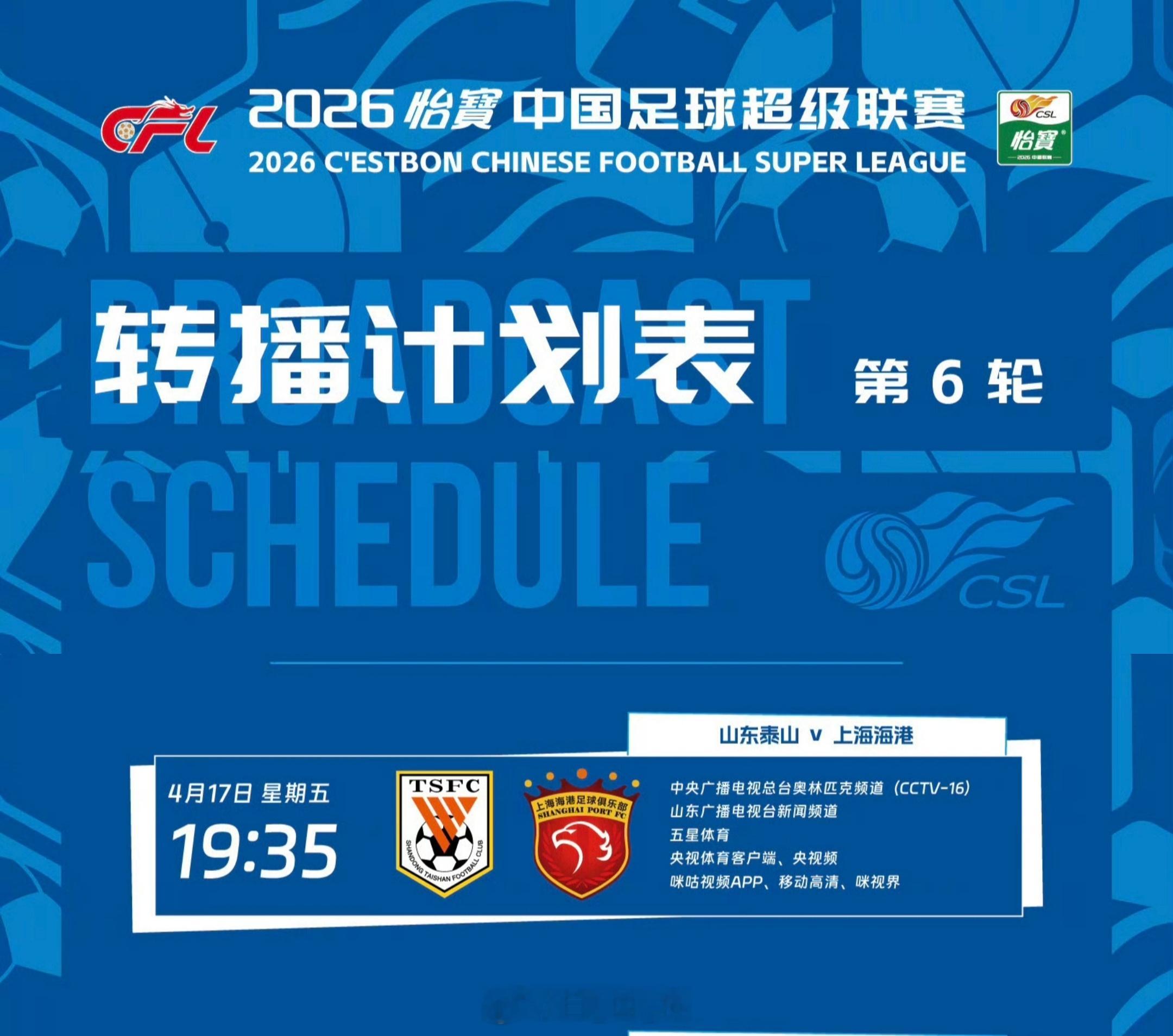 中超联赛第6轮,山东泰山VS上海海港,转播计划表。自由橙山东泰山