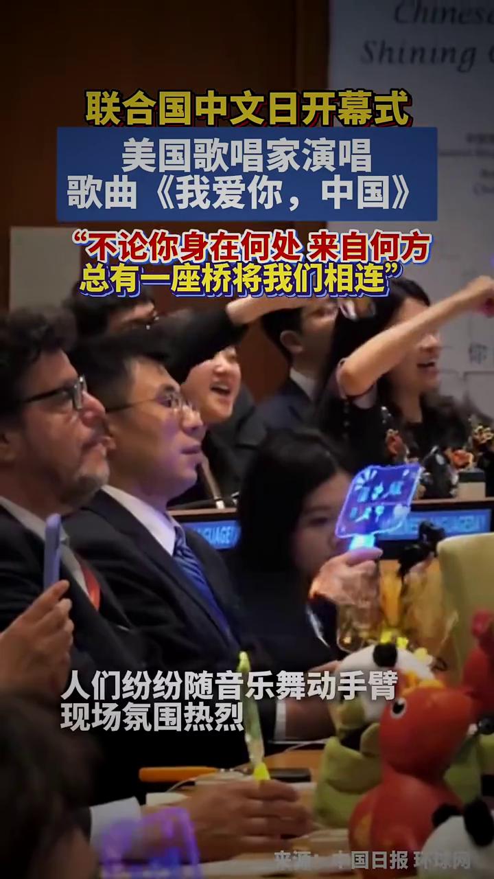 联合国中文日开幕式,美国歌唱家演唱歌曲《我爱你,中国》。 来源:中国日报环球网。 不论你身在何处,来自何方,总有一座桥将我们相连。人们纷纷随音乐舞动手臂,现场氛围热烈。 美国歌唱家葛艾伦,当地时间4月13日,美国纽约联合国总部。联合国中文日开幕式上,演唱了《我爱你,中国》。人们纷纷随音乐舞动手臂,现场氛围热烈。