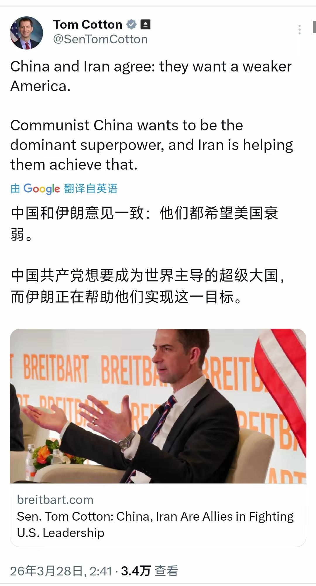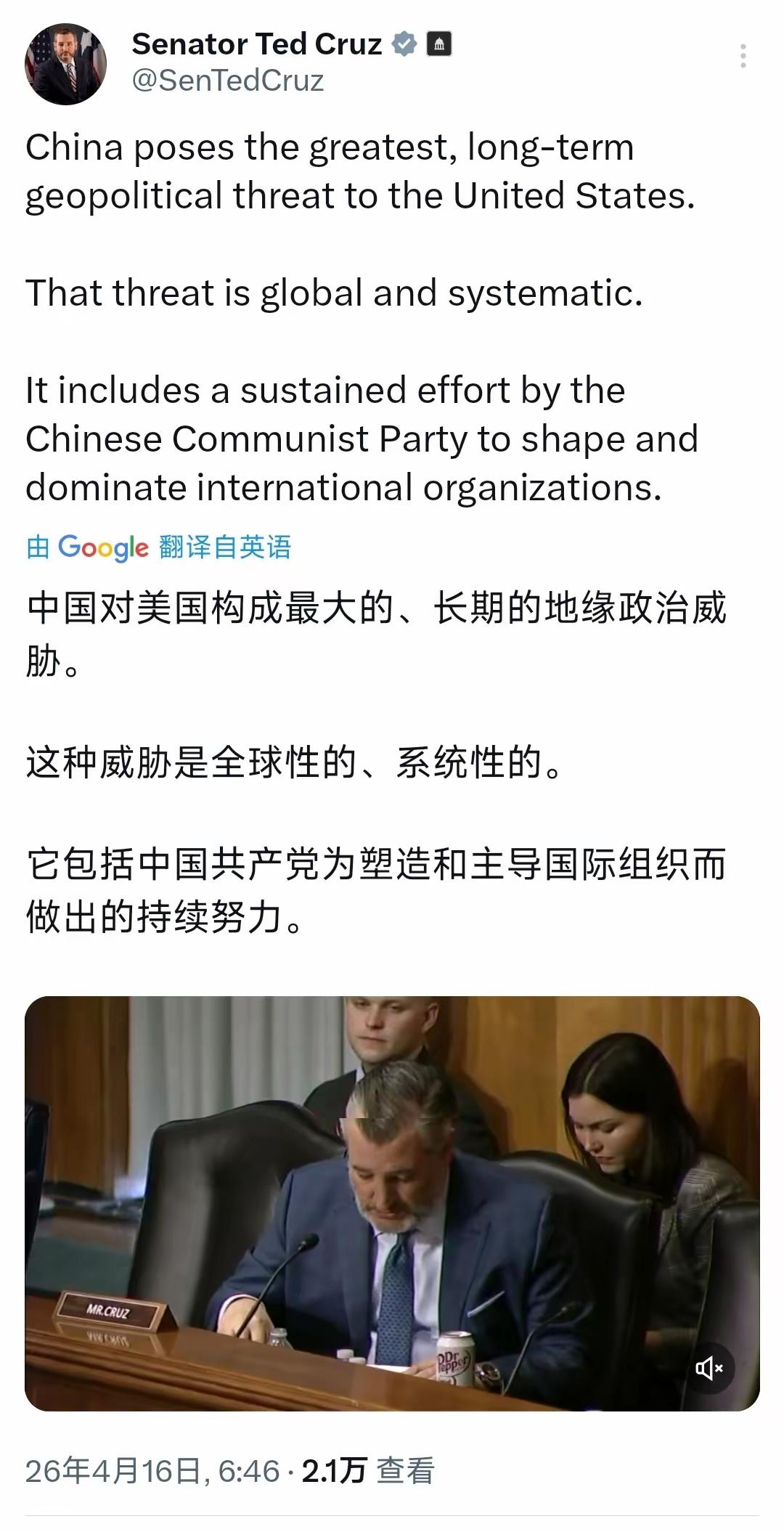 被我方制裁的美国参议员泰德·克鲁兹今天(北京时间4月16日)叫嚣道:“中国对美国构成最大的,长期的地缘政治威胁。这种威胁是全球性的,系统性的。它包括中国共产党为塑造和主导国际组织而做出的持续努力。” 对于这个人以及鲁比奥、蓬佩奥和汤姆·科顿这些被我方制裁极端反华分子,他们把中国说成对美国构成什么样的威胁都不觉得奇怪,因为他们惧怕看到中国强大,对美国的霸权形成钳制,甚至剥夺,他们心里对此恐怖至极,在明知无力阻挡中国崛起时,他们只能转而用这种下三滥方式对美国国内的美国人进行恐吓。但这除了证明他在“努力工作”外,对阻挡中国的崛起没有任何作用。