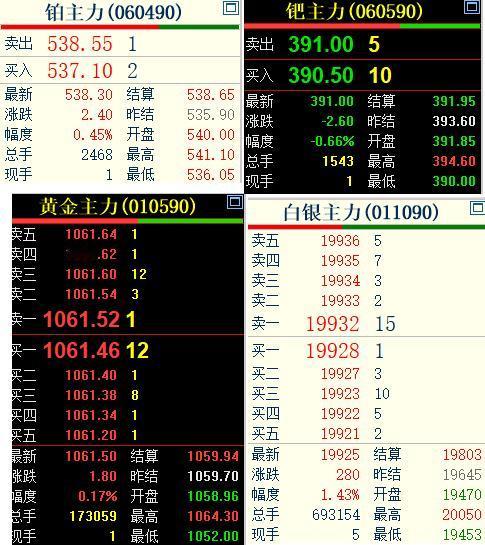 4月16日, 国内贵金属有所分化, 黄金涨幅明显减弱。 通过下面的四分图, 可以很明显看出: 黄金主力上涨0.17%; 白银主力上涨1.43%; 铂主力上涨0.45%; 但是钯主力下跌0.66%。