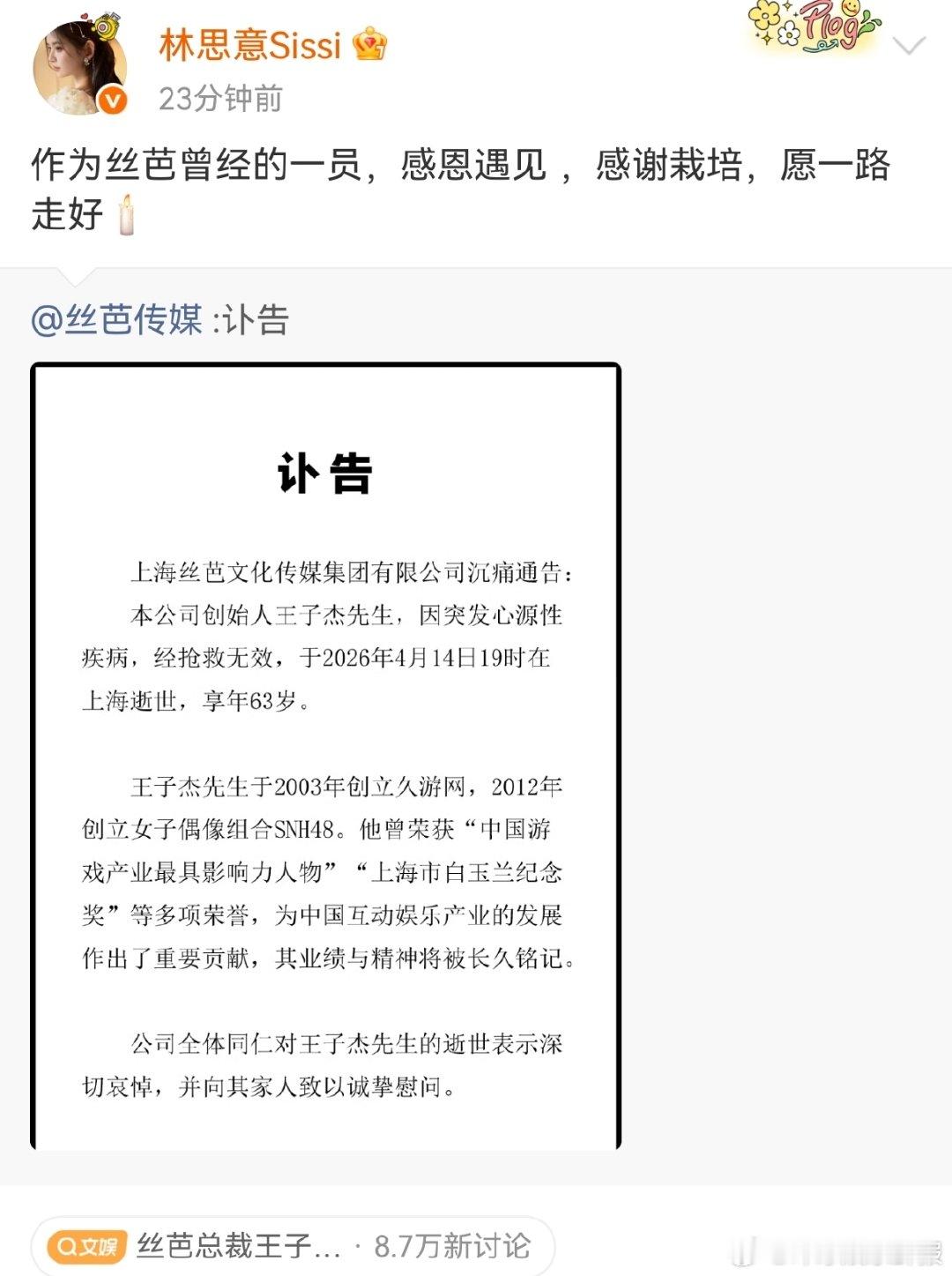丝芭解约成员悼念王子杰丝芭成员悼念王子杰 丝芭成员都转发悼念王子杰,不管是解约的黄婷婷、林思意、莫寒…还是没解约的女孩,都感谢了王子杰的知遇之恩,没有他就没有女孩们的舞台 丝芭总裁王子杰去世