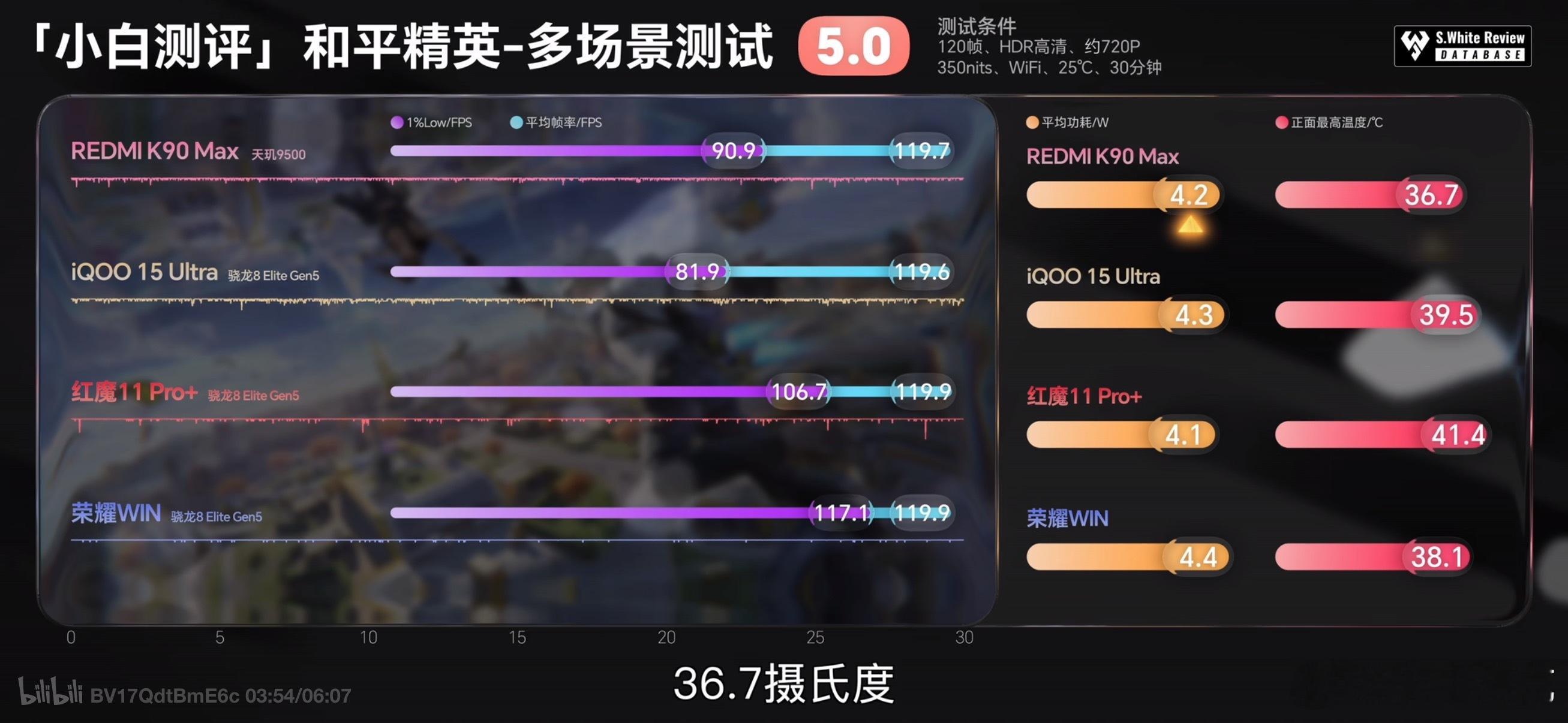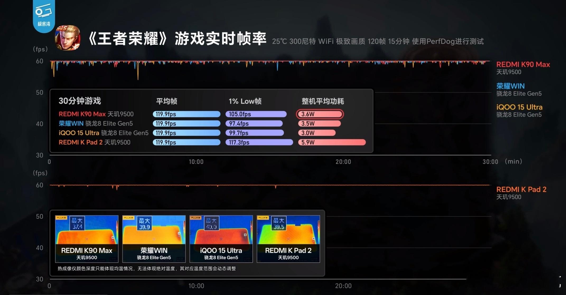 REDMI K90 Max开启风扇散热之后,恒定负载场景下的温度直接降低了9℃。和各家带主动散热风扇的竞品对比,无论是《和平精英》、《原神》还是《王者荣耀》,帧率表现都更稳定,温度也更低。