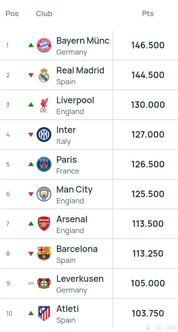 击败皇马后,拜仁在欧洲俱乐部最近五年积分榜完成超越,排名第一位。