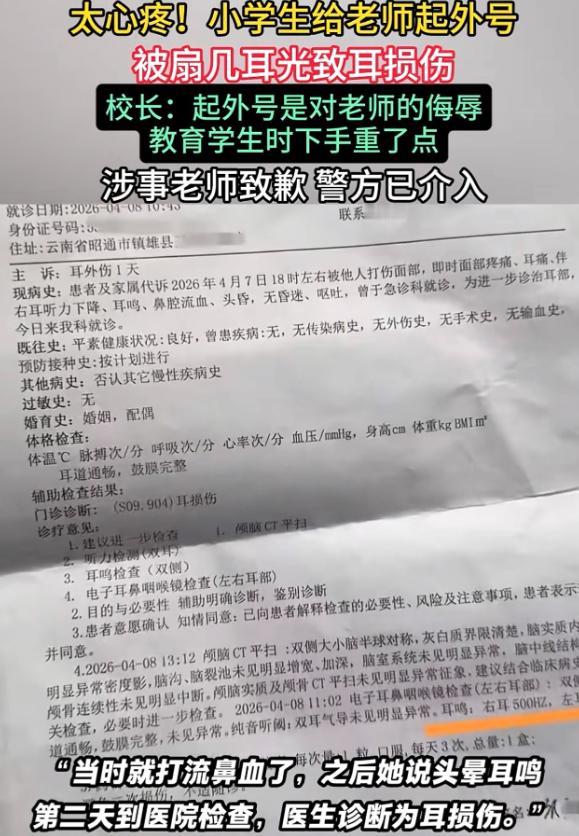 云南,一六年级女学生放学回家,说自己头晕耳鸣,家长发现孩子鼻腔有血迹,追问之下才得知,孩子竟被老师连扇了四个耳光,当场就流了鼻血,家长到学校质问,才得知是孩子给老师取了个难听的外号所致! - 2024年4月7日云南某私立学校发生一起事件,四个耳光换来三百块钱,引发外界关注。 12岁女孩王菡放学回家后整个人瘫在沙发上说头晕耳鸣,家长发现鼻孔有干涸血痂情况异常,引起重视, 孩子随后断断续续说出当天在学校被老师连扇四个耳光情况令人震惊,家长听后十分震惊并立即追问。 事情起因是课间聊天时给老师起了不好听外号并被传到老师耳中随后被叫到办公室处理,过程被放大了。 老师先询问是否承认孩子沉默后找学生作证最终承认后发生严重后果。 当场出血鼻子流血孩子眼前发黑被打懵一直忍到放学回家才说出情况,后续才被家长发现严重情况暴露。 家长带去医院检查结果显示右耳外伤双耳耳鸣但头部检查无异常鼓膜未破医生建议复查避免剧烈运动。 孩子之后行动受限医生叮嘱需要定期复查不得剧烈运动恢复期较长需要持续观察影响日常生活安全性。 当天晚上家长携带检查报告前往学校沟通校方回应承认老师下手重但称是教育行为引发争议持续发酵。 很多人质疑起外号虽不当但动手是否合理界限在哪里引发讨论社会舆论持续关注扩散热度上升明显。 老师与学校行为边界成为讨论焦点暴力教育被普遍质疑社会关注增加事件持续发酵引发反思问题了。 警方介入调解老师承认道歉并提出三百元补偿希望私下解决但家长拒绝接受金额与伤害不匹配引争议。 从法律角度看未成年人在校受伤学校与教师均可能承担责任规定明确法律边界清晰不可忽视约束力强。 网络讨论激烈有人认为孩子不尊重老师也有人认为暴力不可接受分歧明显持续扩大舆论升温引关注。 教育问题核心在于界限控制与沟通方式暴力并非解决办法需要更合理方式制度与沟通缺失问题突出。 孩子长期心理阴影可能比身体伤害更难恢复情绪影响明显需长期关注心理修复过程缓慢不可忽视性。 教育底线不应依靠暴力维持四个耳光留下裂痕三百元无法弥补信任崩塌难以修复社会应反思问题了的。