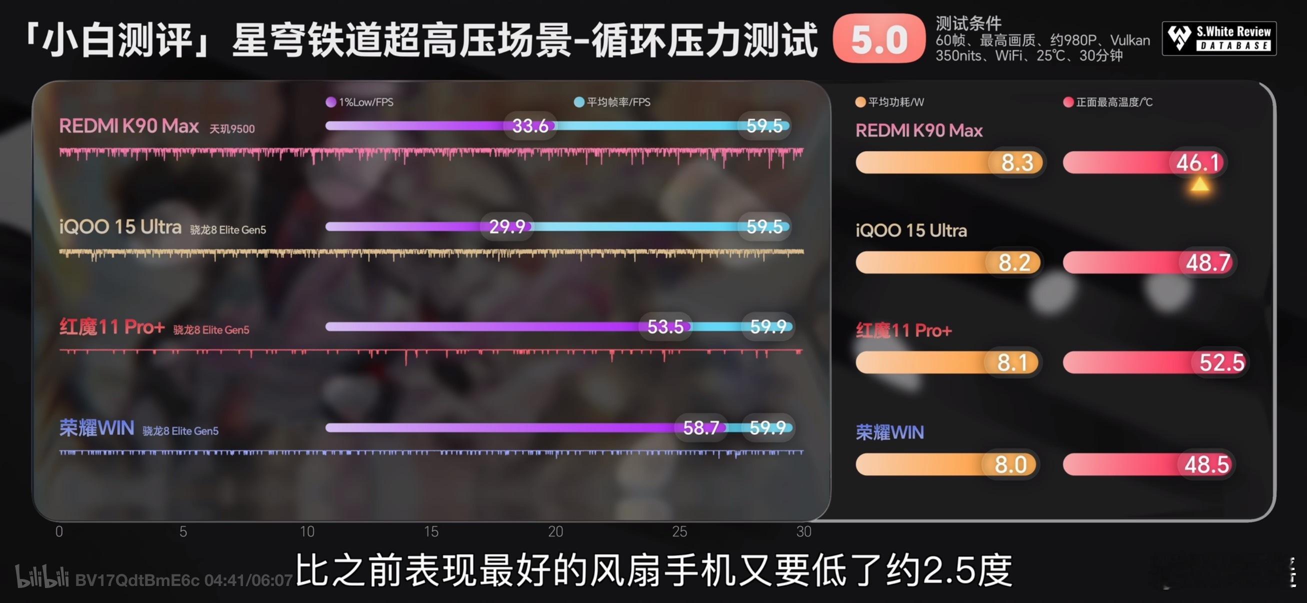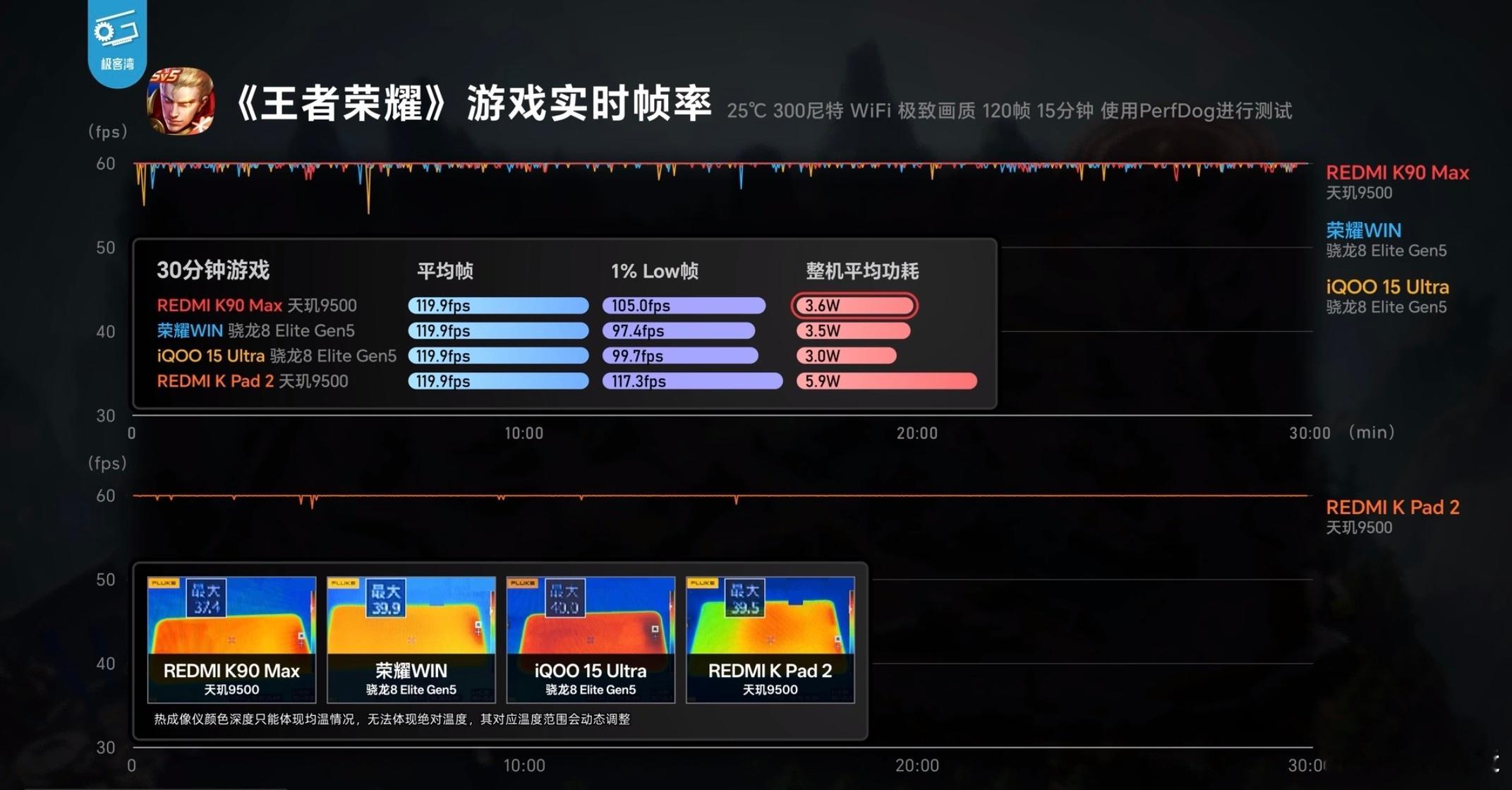 小白测评和极客湾的最新实测显示,K90 Max在《原神》极高画质、《崩坏:星穹铁道》联机等高负载场景下,帧率稳定性直接拉满。《原神》60 帧满画质运行 1 小时平均 59.8 帧,正面最高温仅 40.4℃(小白测评);《崩坏:星穹铁道》高压循环测试平均 59.5 帧,全程没有出现明显的降频锁帧现象。极客湾实测《王者荣耀》144 帧模式全程满帧运行,帧率曲线几乎是一条直线,稳定性碾压同价位所有被动散热机型