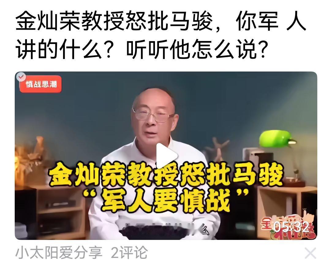 马骏讲“军人要慎战”是正确的,不知金灿荣为何要“批”,而且是“怒批”。以当下两场战争为例,四年前以世二军的实力,俄罗斯发动了对乌克兰的闪电战,打到现在四年多了,伤亡超百万,不仅没有打服乌克兰,而且乌克兰现在天天用无人机轰炸俄罗斯能源设施,普京除寄希望特朗普帮忙外无计可施。今年2月底,世一军美国联合以色列对伊朗发动打击,仅管伊朗元气大伤,但仍对美以反击,并打击海湾国家,推高石油价格,让特朗普骑虎难下。如果普京和特朗普知道“慎战”二字是怎么写的,何以致叱。
