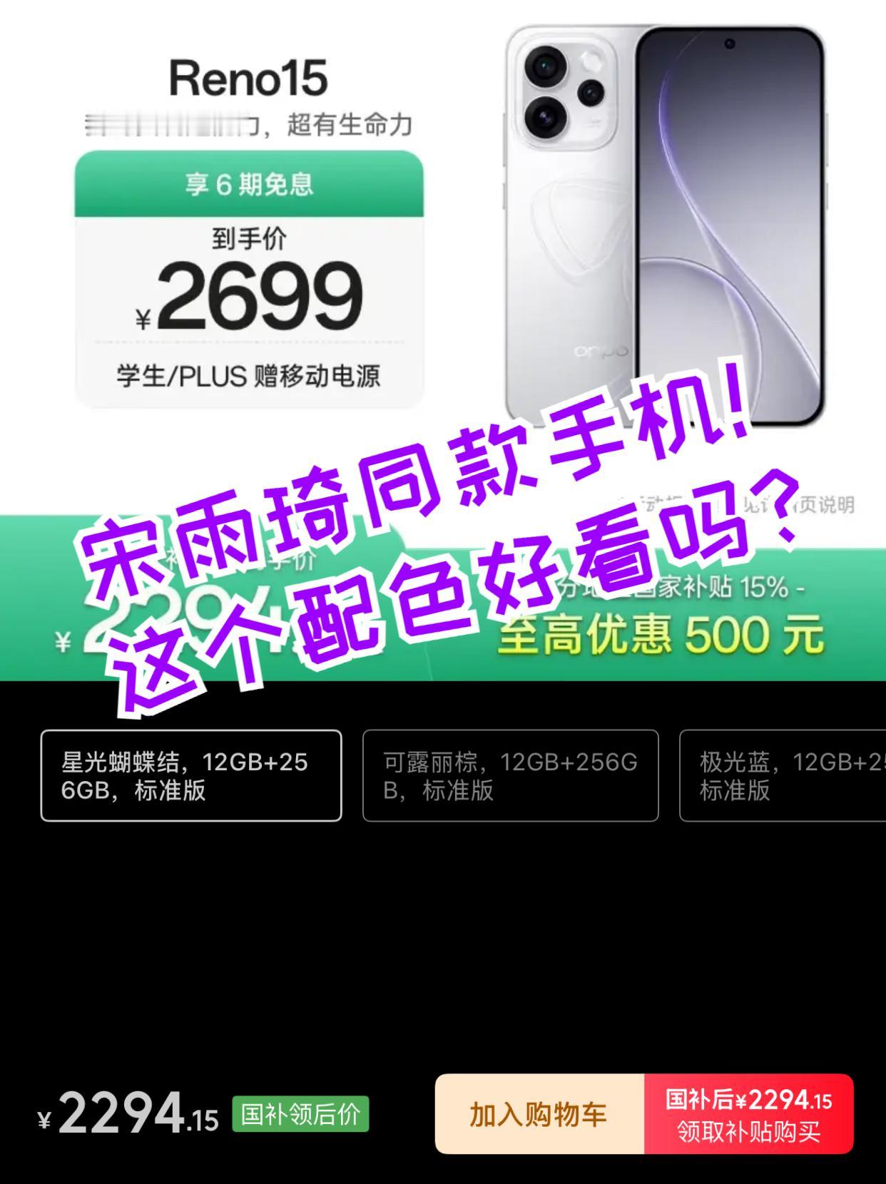 纠结三年换手机!抄底宋雨琦同款值不值? 手机用了三年多了 一直想换,一直没下手 最近又刷到好几个品牌同时官宣涨价就更焦虑了 然后我去翻了一圈2000-3000这个价位,基本上都涨价了,之前看到的宋雨琦同款OPPO Reno15系列还没涨价,2699的价格,加上15%的国补,到手大概2294,现在这个价算不算抄底价? 这手机本来就挺喜欢的,宋雨琦同款的星光蝴蝶结配色,玻璃背面是全息光刻工艺,光线一打过来有裸眼3D那种层次感,6.32英寸小直屏,单手拿着不累,6200mAh大电池,还有2亿像素主摄,可以拍各种风格的Live图,ColorOS系统听朋友说也很好用。 我看有帖子说OPPO Reno15系列后续也可能要涨300左右了,有点担心错过现在这个价。