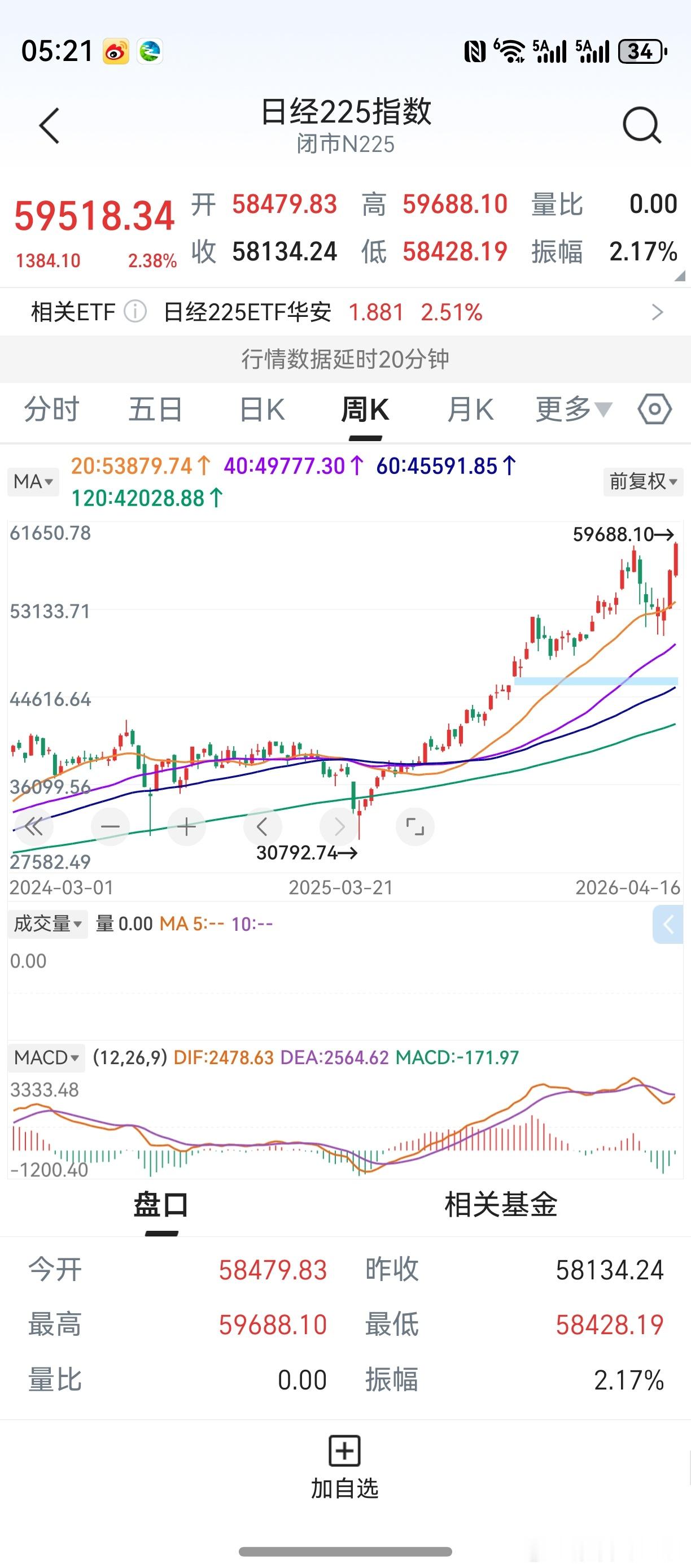 继纳斯达克后,日经指数也创了历史新高?20周线圆弧向上,“半个月亮爬上来”。20.40.60周线,“三线成一点”。凡成功图形,后面都是“三线平行比天高”。突发事件影响一时,但影响不了内在规律。应作如是观。