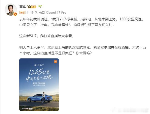 雷军会亲自直播15小时,开着新一代小米SU7从北京到上海,1265公里中间只充一