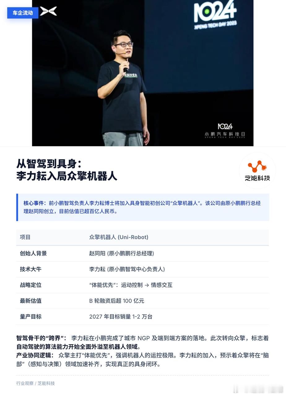 前小鹏智驾负责人李力耘博士将加入具身智能初创公司“众擎机器人”,由原小鹏鹏行总经理赵同阳创立,目前估值已超百亿人民币。