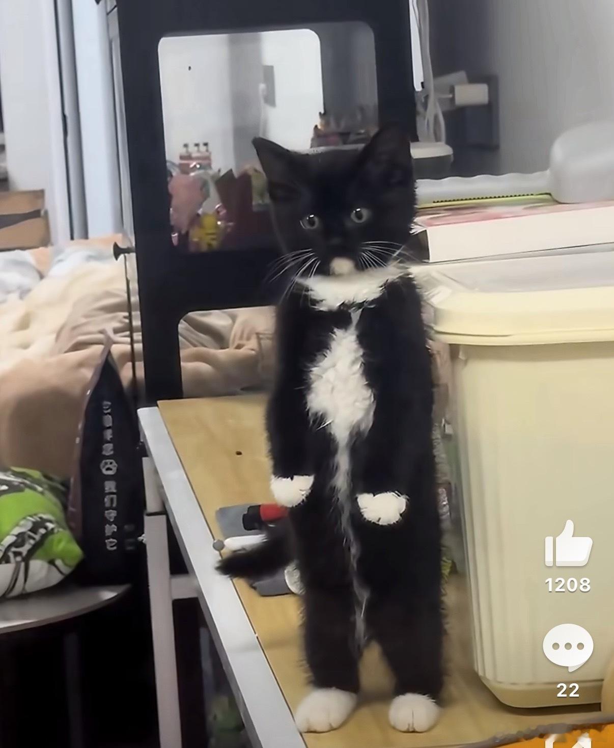 被食物香到站起来闻的猫咪猫咪:平时吃的是啥啊,这才是猫咪应该吃的,妈妈你说对吧