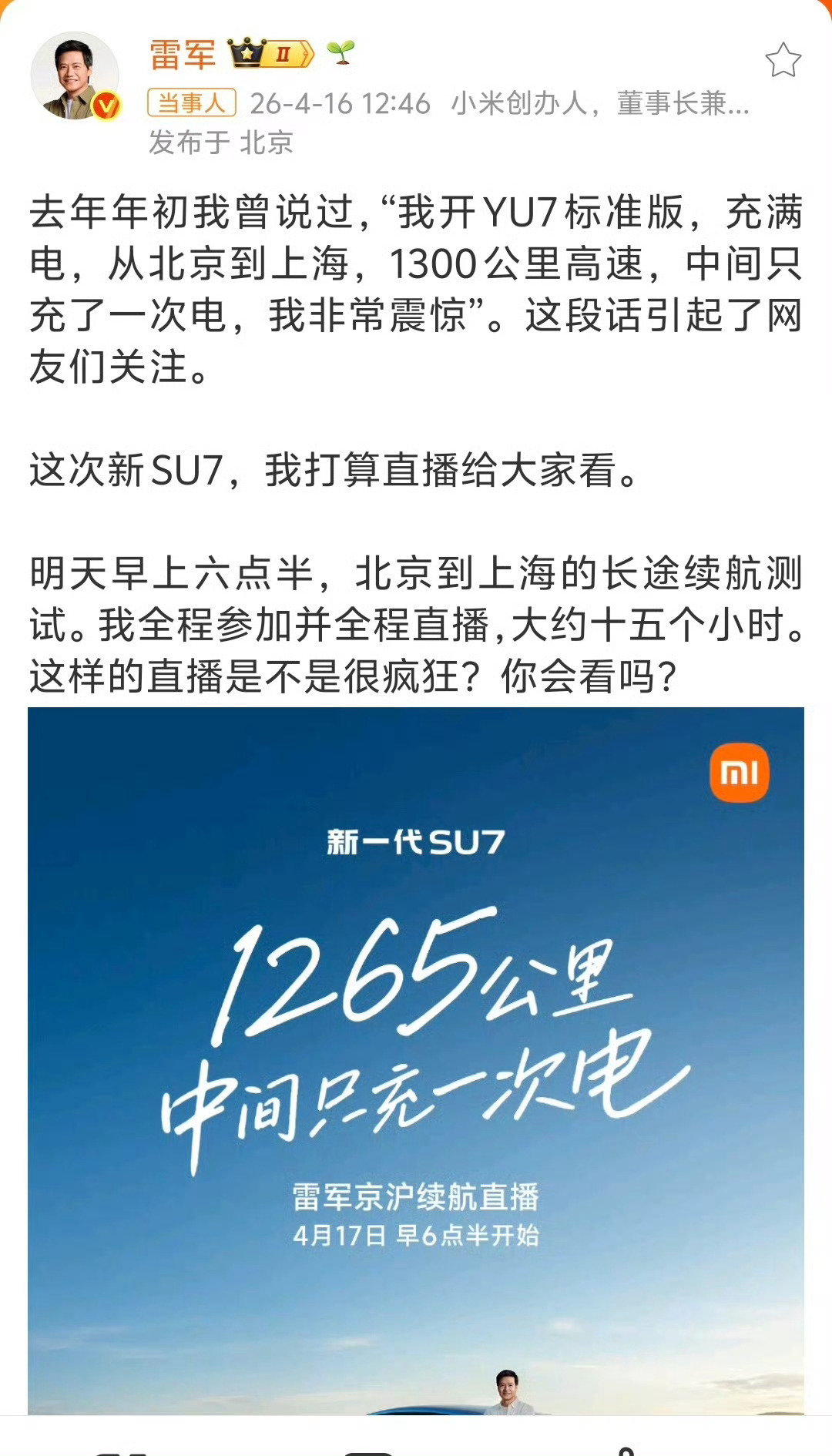 雷军真的太拼了,为了让网友更好了解新一代小米SU7性能,将在4月17日早上6:3