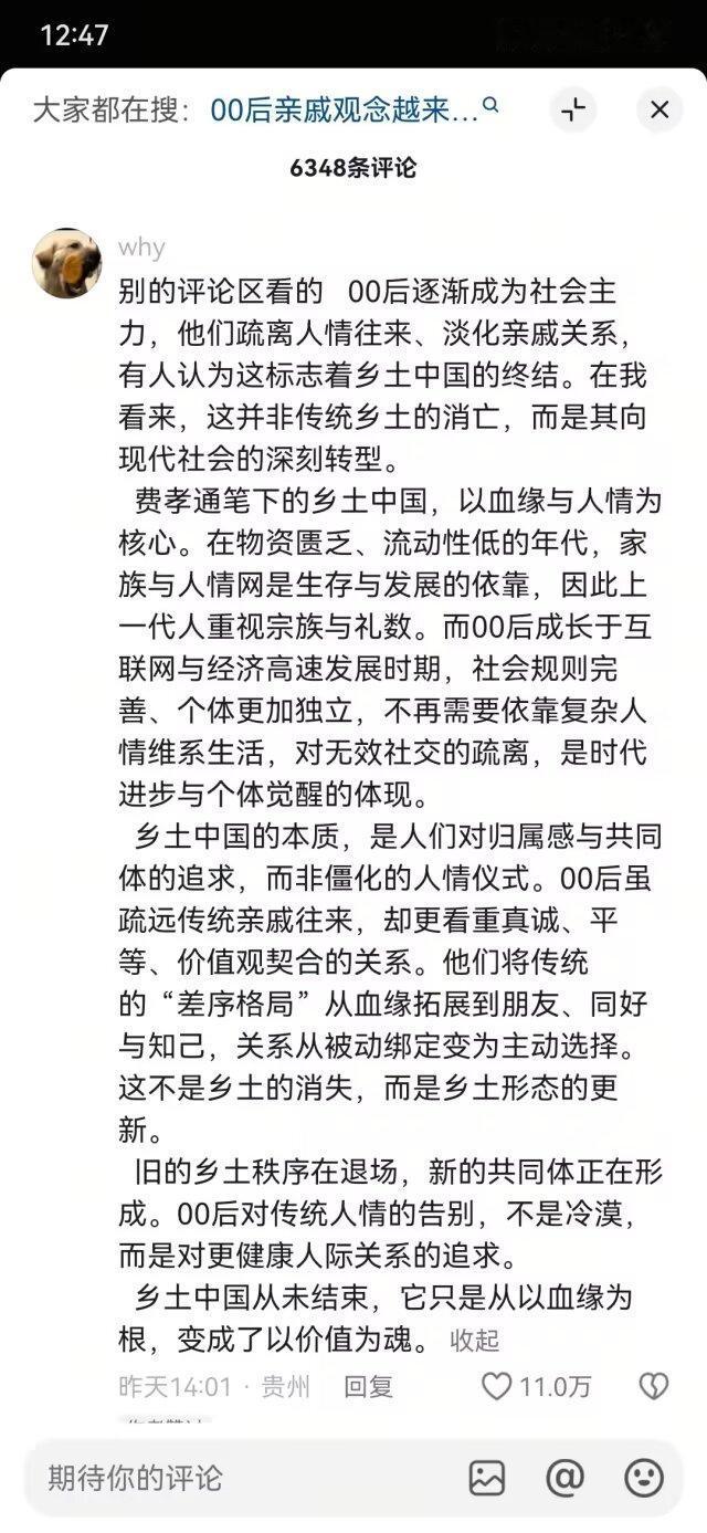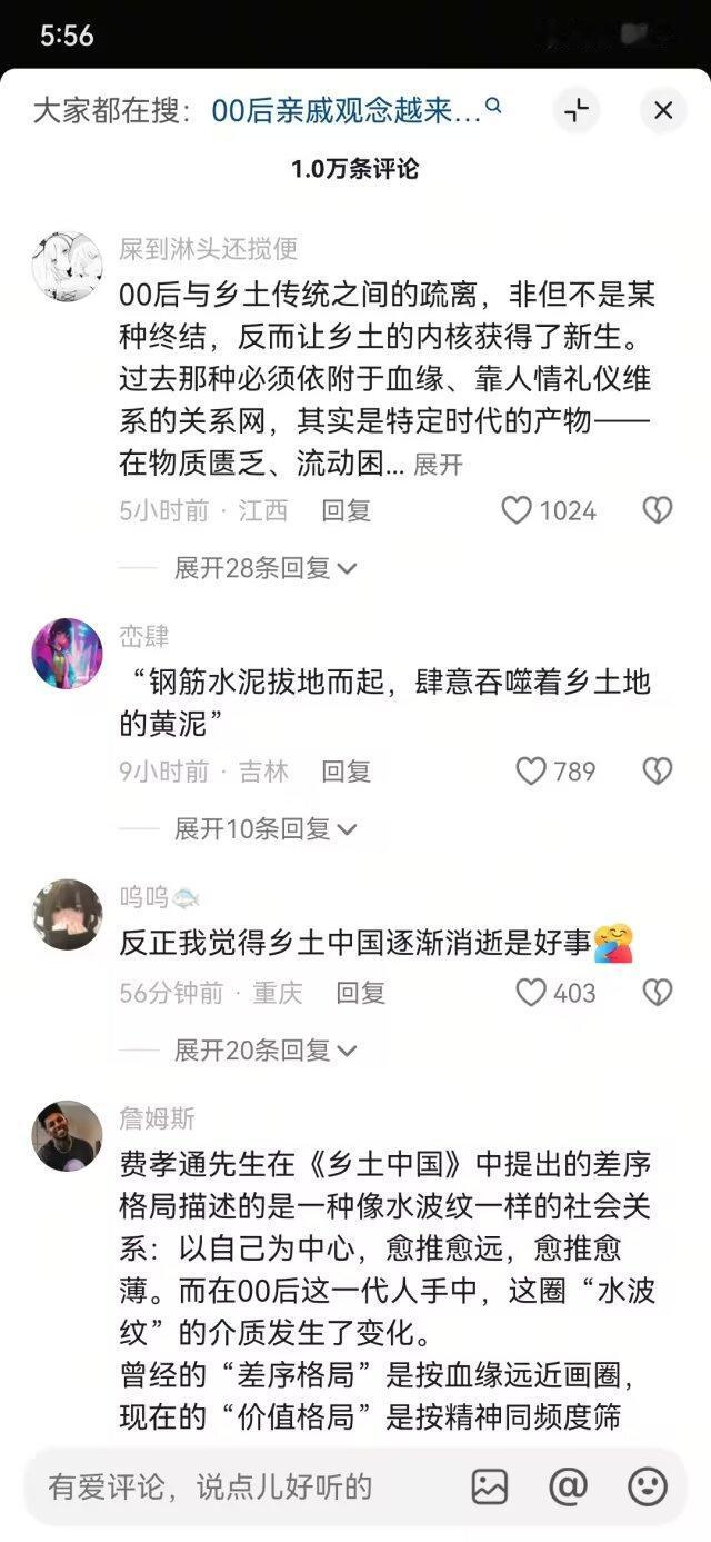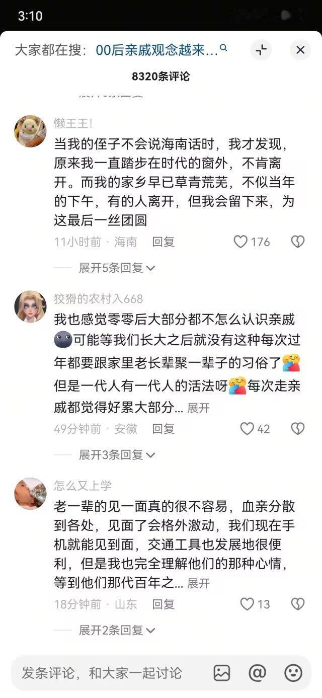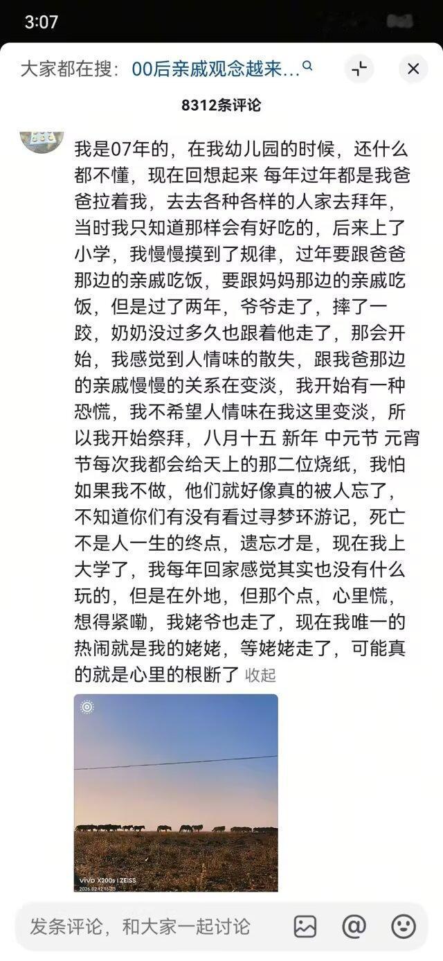 几年前一次家族聚餐,父母辈有说有笑其乐融融,小辈尤其是大一点孩子交流却很少。我突然冒出一个疑虑(准确来说是焦虑):到了我们这一辈,还能拥有这么热闹的家族聚餐吗? 今天偶然刷到一个视频,我的疑虑好像解决了。紧接着便感到有点难受,因为我舍不得,不只是氛围、传统、关系,还有那句“明年再回来”… 想了好长时间,最终还是释然了,毕竟下一代就是我们,我们可以选择,对,可以选择