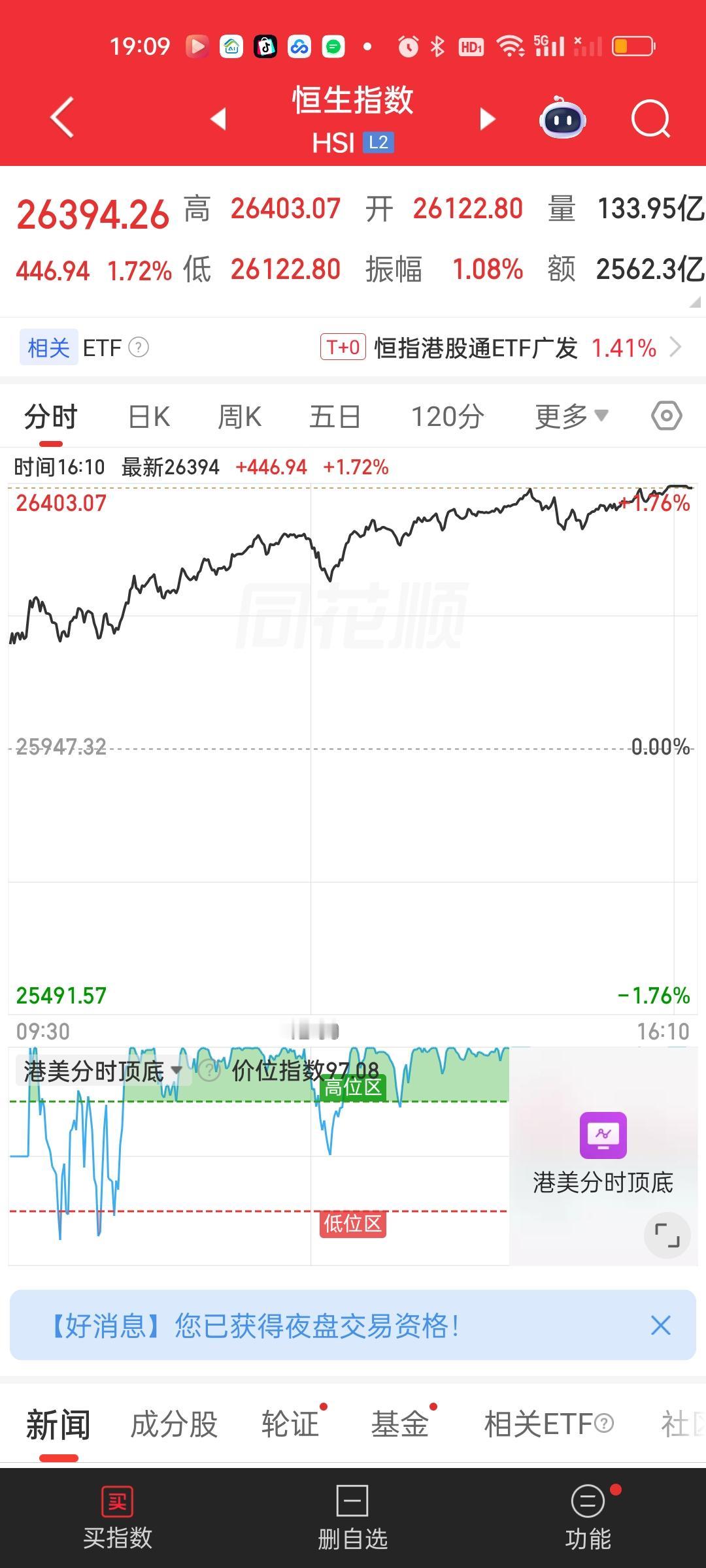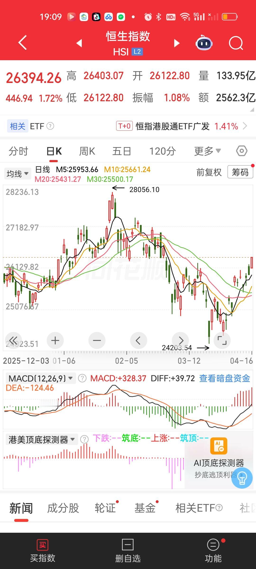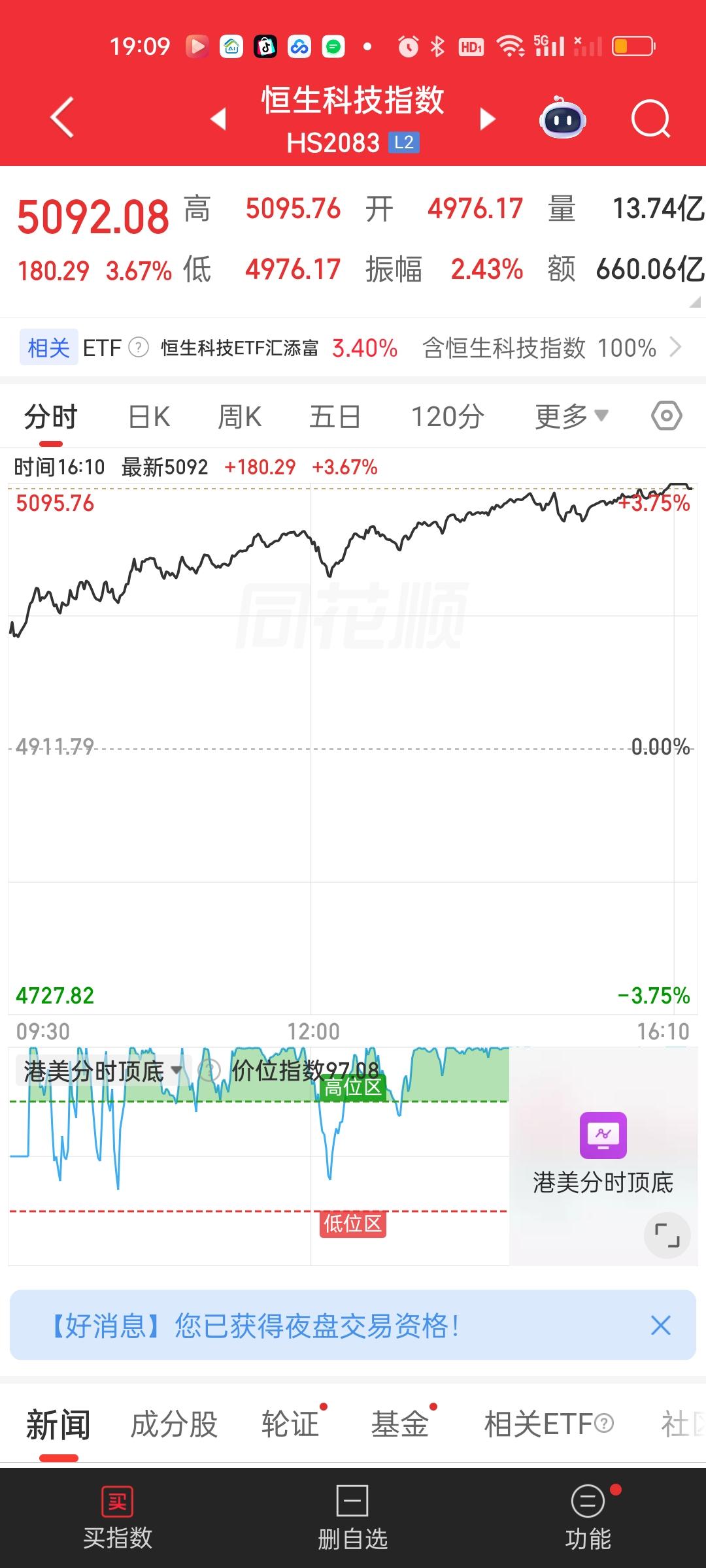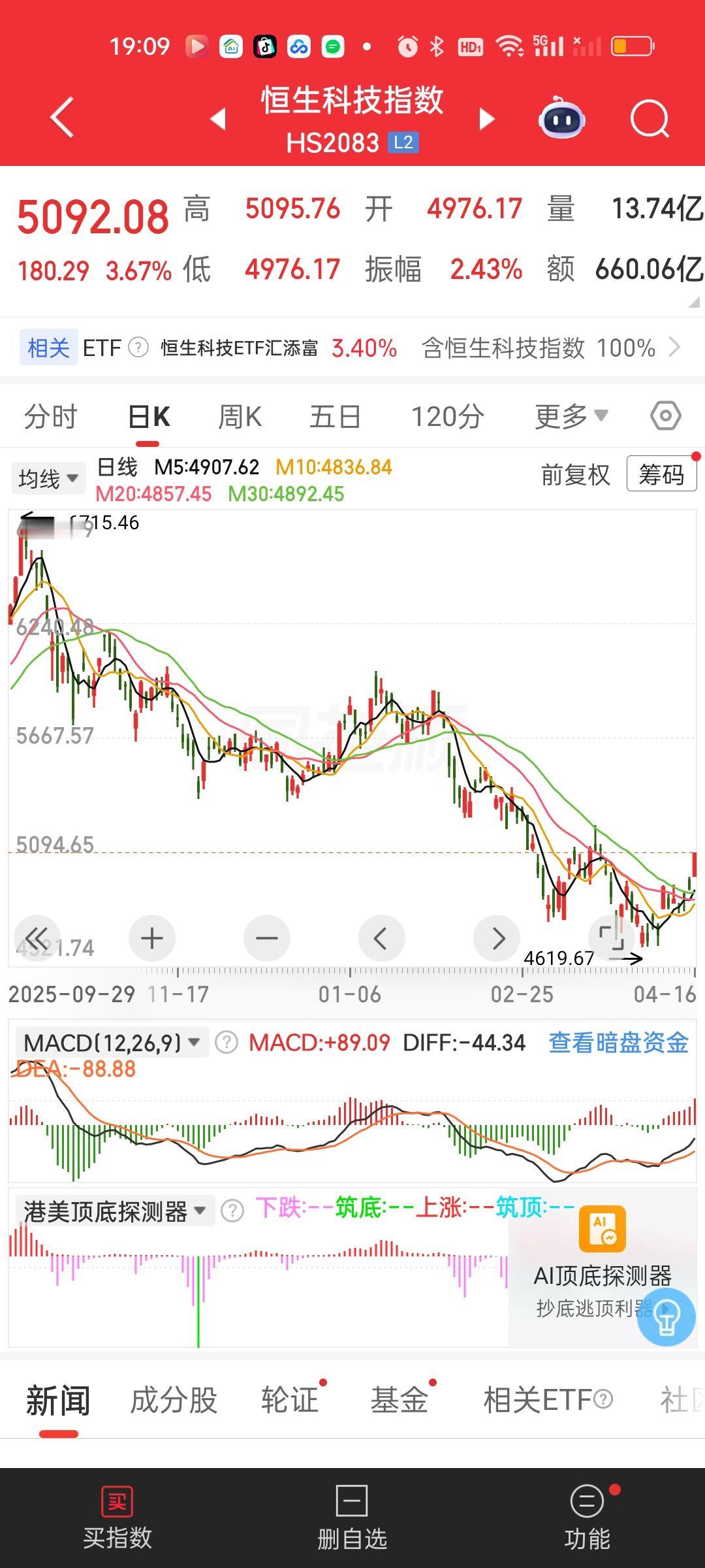 港股今天表现也非常强势。两大指数收盘依旧稳稳站在所有均线的上方。如果外部没有特别大的利空,预计涨势还将继续,这里就要格局了,这个地方你不要轻易出了。 恒科前低4619.67,今天收盘5092.08,5092.08/4619.67=1.1023,才几个交易日已经涨了10.23%了,我之前说过的应对策略是不是又对了?收益是不是远远高于银行一年期定期存款了?左侧交易其实很不好做,需要强大的信念支撑。因为你不知道哪里才是真正的底部。在底部一直趴着的日子很煎熬。很多人根本就扛不住。