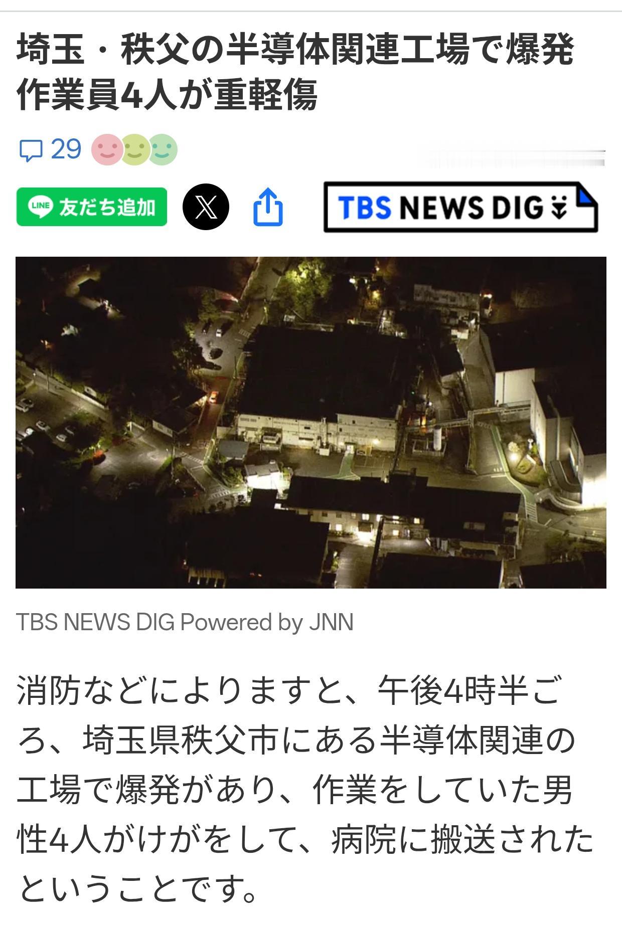 日本力森诺科半导体工厂爆炸四人重伤 据日媒《TBS新闻》4月16日报道:今天下午4点30分左右,位于埼玉县秩父市的力森诺科半导体工厂发生爆炸,四名正在工作的男子受伤被送往医院。 现场警车聚集,伤者中两人重伤但意识清醒。 据称,八名工人正在清理工厂外被拆除的管道,当他们向管道中注入水和化学混合物时发生爆炸,破裂的管道击中了工人。 日本工厂火灾 半导体 芯片 头号创作者激励计划 日本 我要上精选-全民写作大赛