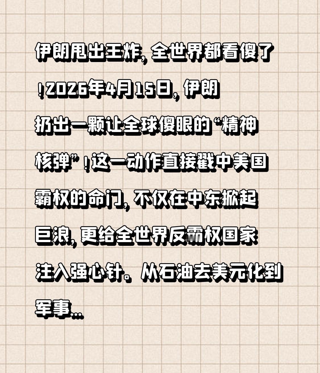 伊朗甩出王炸,全世界都看傻了! 2026年4月15日,伊朗扔出一颗让全球傻眼的“精神核弹”!这一动作直接戳中美国霸权的命门,不仅在中东掀起巨浪,更给全世界反霸权国家注入强心针。从石油去美元化到军事自主,伊朗用硬实力打破西方封锁,用行动证明:霸权不是不可战胜!这颗“精神核弹”,正在重塑全球秩序!:你认为伊朗这步棋,会给世界带来怎样的连锁反应? 伊朗重磅消息 反霸权 中东局势