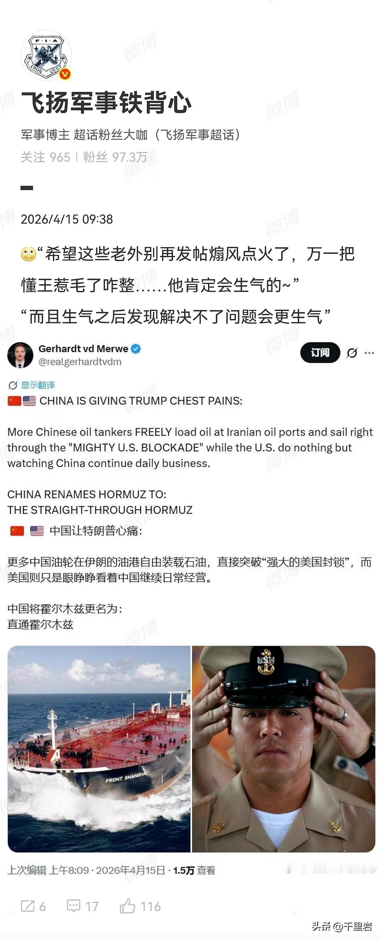 外媒大力炒作中国的超级油轮在海军舰艇的护送下,无视美国的海湾封锁。这当然不会安什么好心!但是我们根本不用怕!! 他们必须是羡慕嫉妒恨啊。 毕竟美国早早就放话说了,中美之间是战略竞争关系,中国式竞争博弈对手。 他们虽然也分了369等,但是在美国那边好歹都算盟友。现在看见盟友的待遇还不如对手的待遇。 换了你心里气儿平吗?? 别以为老川普像小孩子一样只会斗气,人家是个精明的商人,而且是非常精明的那种!! 玩政治,上手腕也许不如老政客,有的时候不免简单粗暴了点。但是在利益判断上他可丝毫不差。 所以前面他已经尝过了跟中国对着干的滋味,现在不管我们干什么,只要他能在跟我们合作中间得到好处,能回家接着搞他的赢学,这就够了! 在这个基础之上,他算得清楚着呢!!