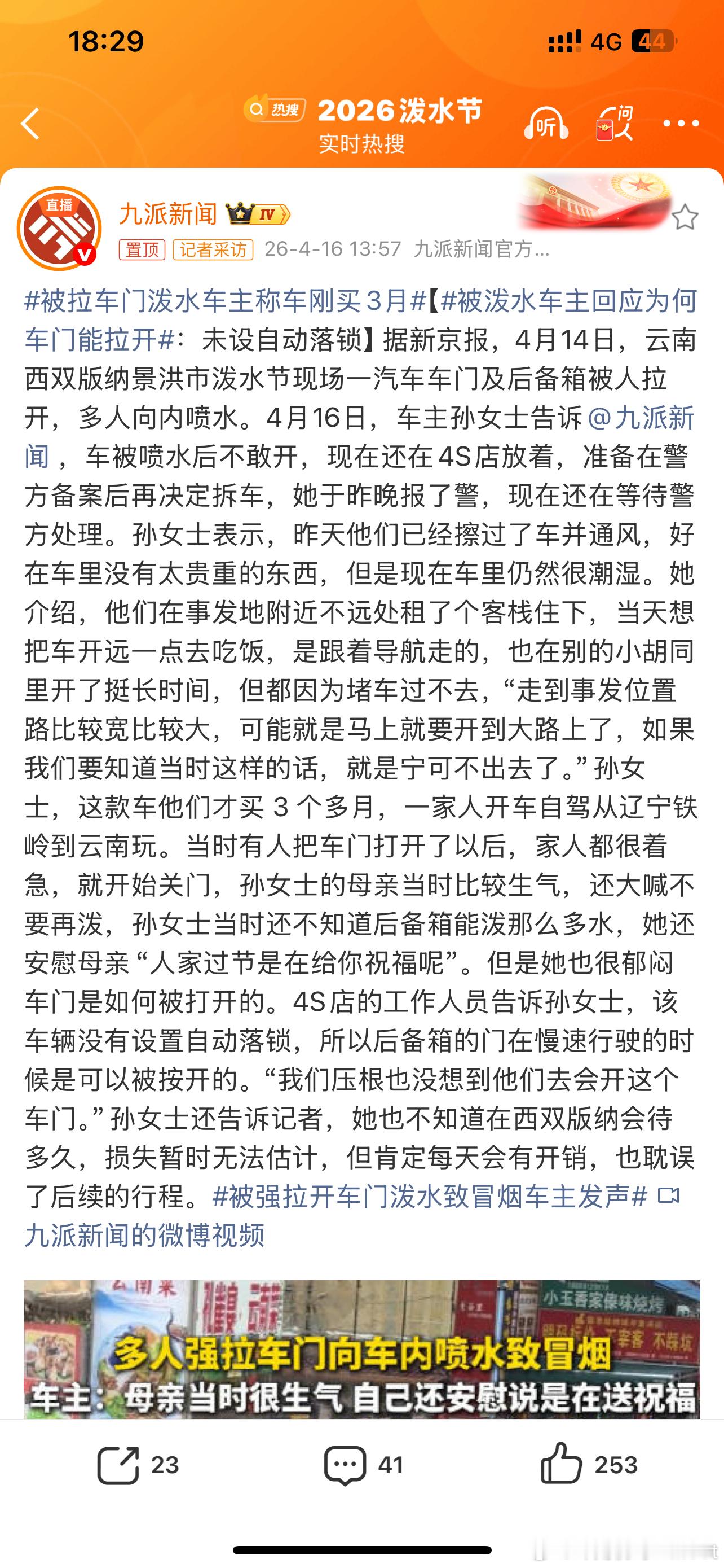 被泼水车主回应为何车门能拉开感觉好像每年都有这种乌龙事件出现本来是凑个热闹没想到这下被误伤把车也搭上了